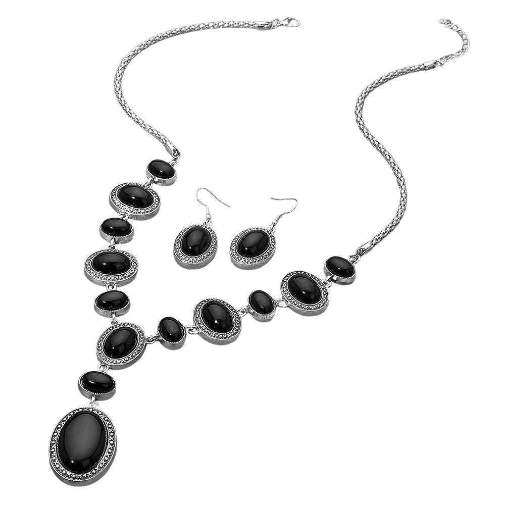 Details • Necklace Size : 24" + 2" L • Decor Size : 2.3" L • Earrings Size : 1.75" L • Make a striking impression with this elegant jewelry set featuring an array of oval accents arranged in a cascading silhouette. Paired with matching drop earrings, this standout design brings a refined, vintage-inspired touch that instantly elevates evening outfits and special occasion style. • Lead and Nickel Compliant