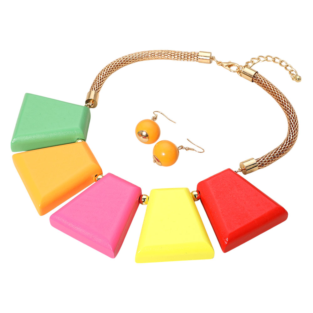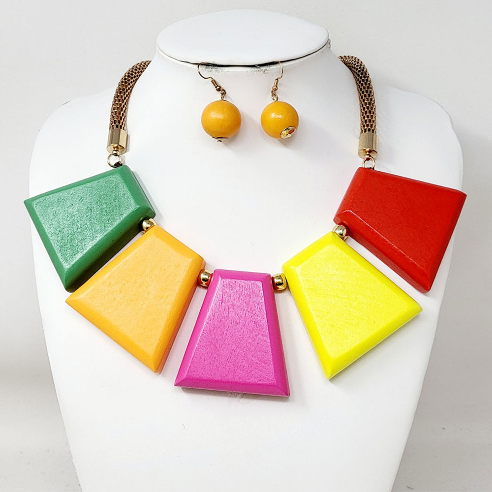 Details • Necklace Size : 20.5" + 3.25" L • Decor Size : 2.25" L • Earrings Size : 1.75" L • Bold trapezoid necklace and earring set with chunky geometric wooden beads and mesh chain. Perfect for adding a playful, artistic edge to any modern outfit or creative look. • Lead and Nickel Compliant