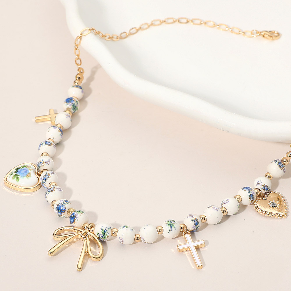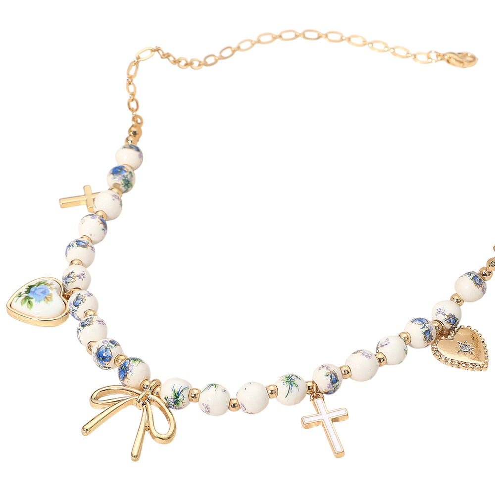 Bow Cross Heart Charm Beaded Floral Beaded Necklace