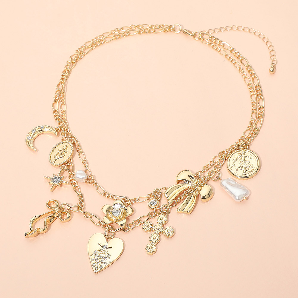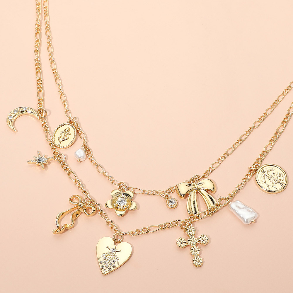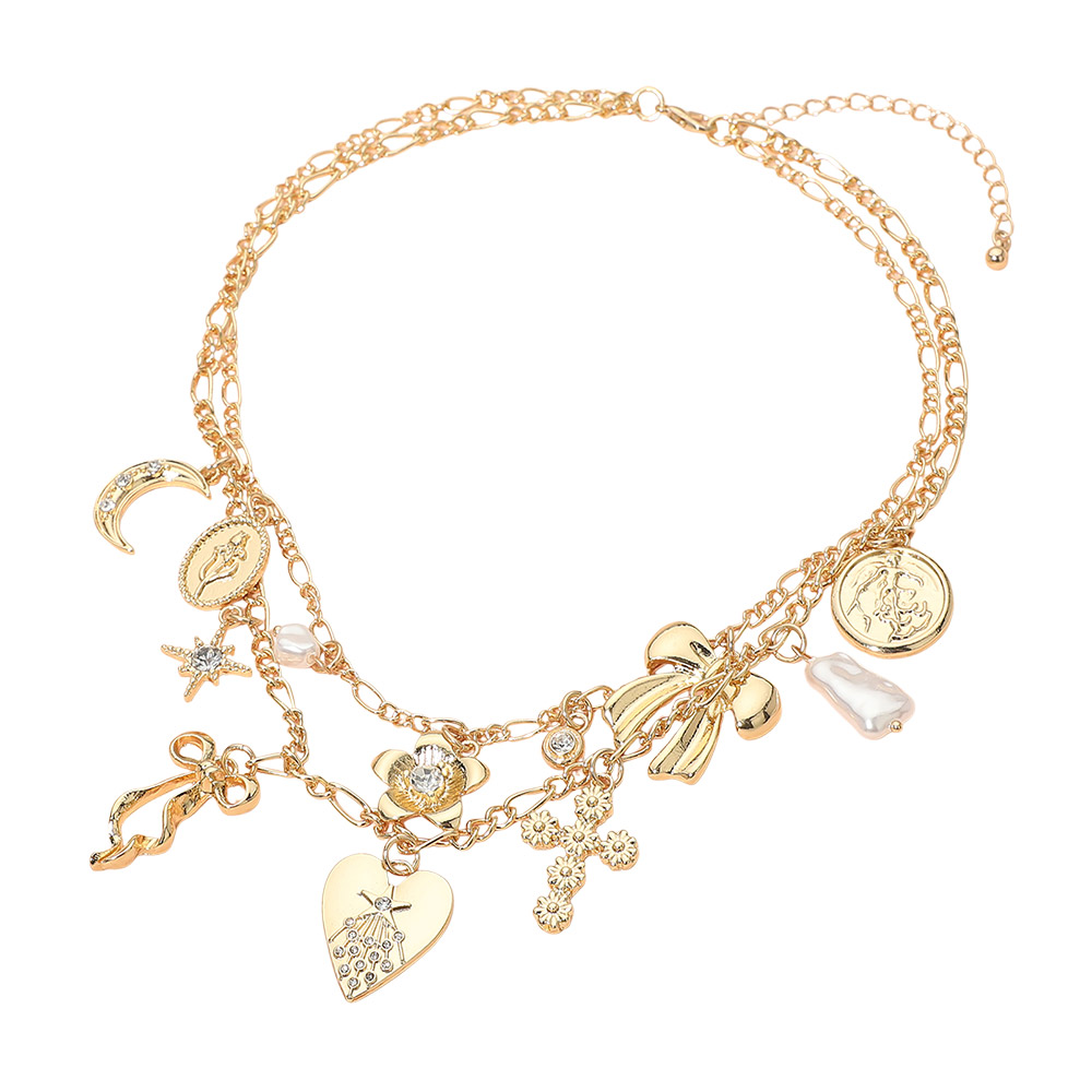 Details • Necklace Size : 16" + 3" L • Decor Size : 2.5" L • Statement layered charm necklace featuring mixed symbolic accents and delicate chain detailing for a curated, fashion-forward look. Designed to elevate casual and dressy outfits, this versatile piece adds personality, movement, and trend appeal to modern accessory collections. • Lead and Nickel Compliant