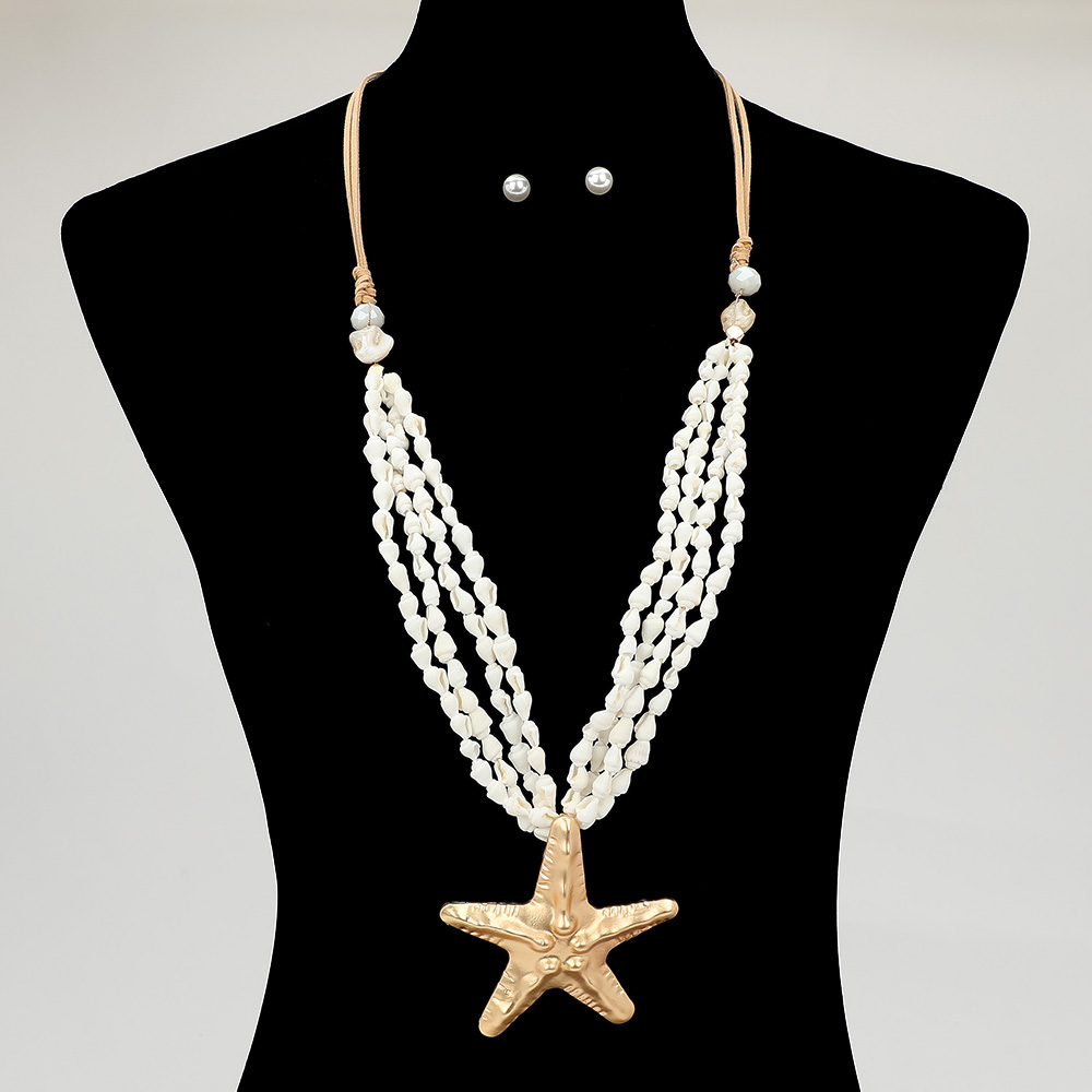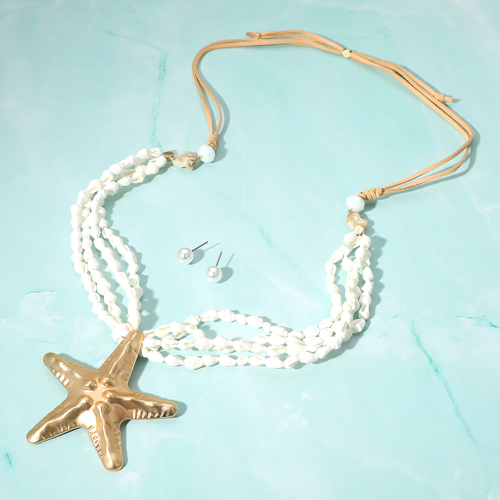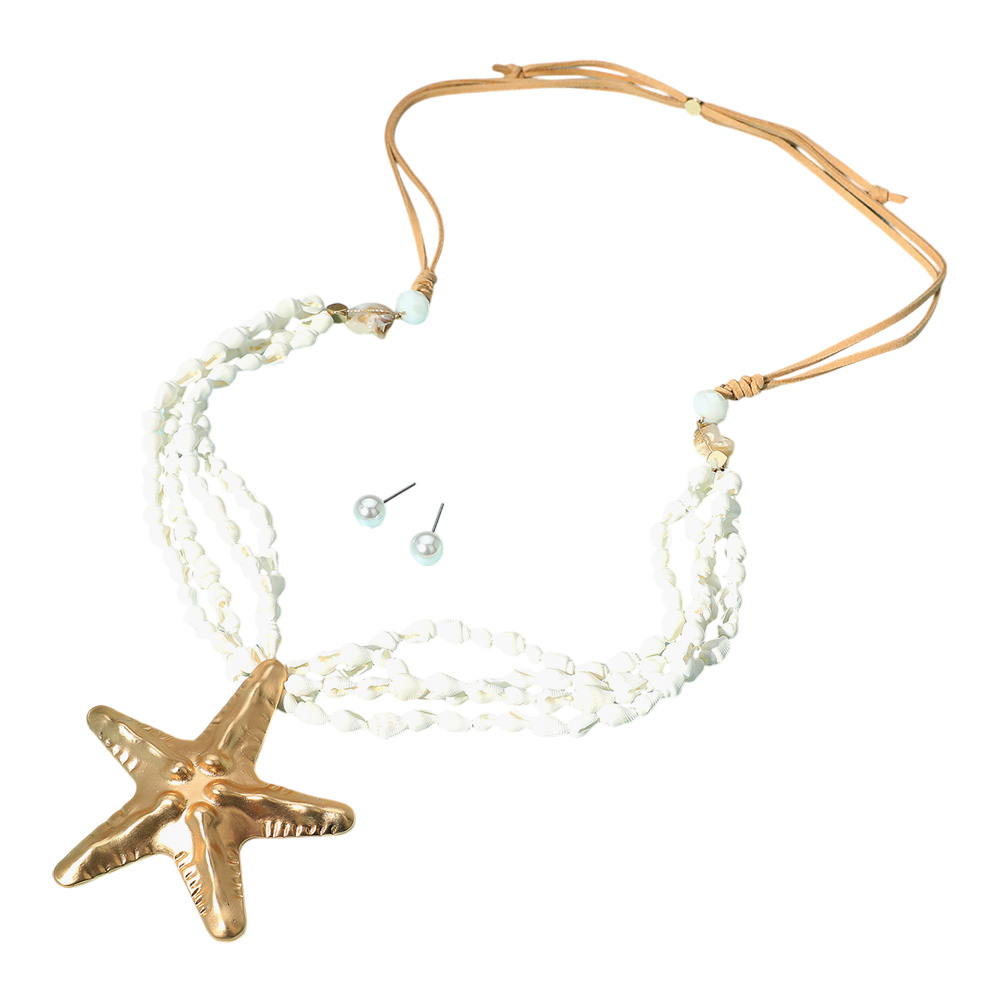 Brushed Metal Starfish Pendant Pointed Layered Puka Shell Beaded Adjustable Necklace