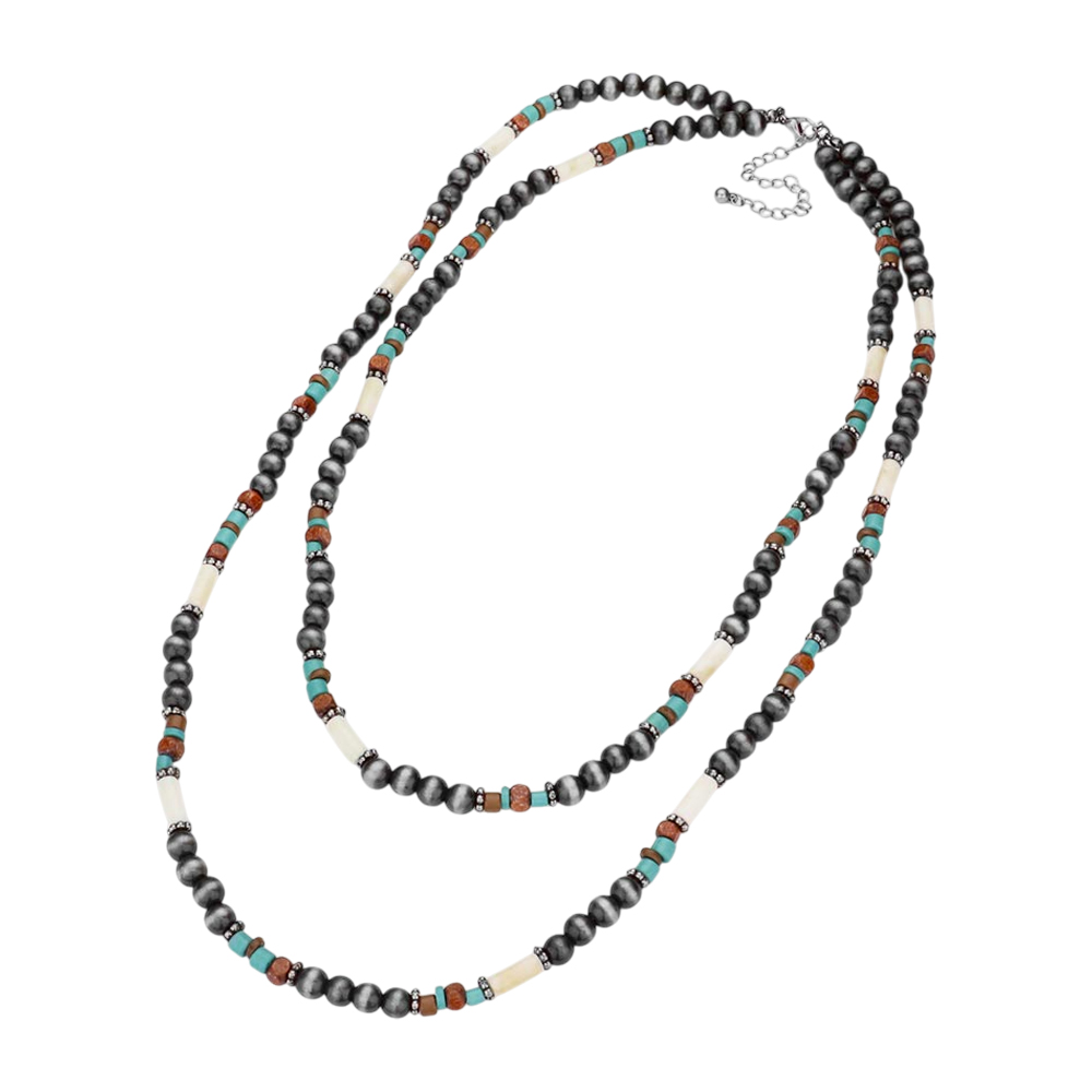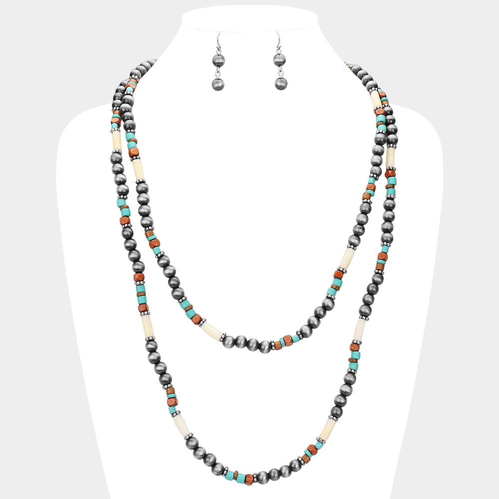 Burnished Metal Ball Wood Beaded Double Layered Necklace