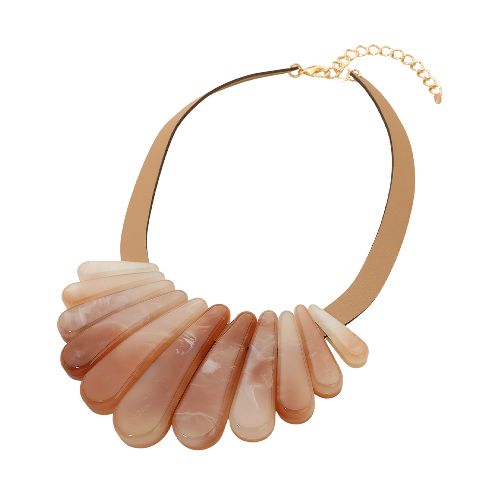 • A striking statement necklace featuring sculptural fan-shaped resin pendants arranged in a graduated pattern. Bold and artistic, this unique piece elevates any outfit, making it the perfect accessory for standout style and modern elegance.