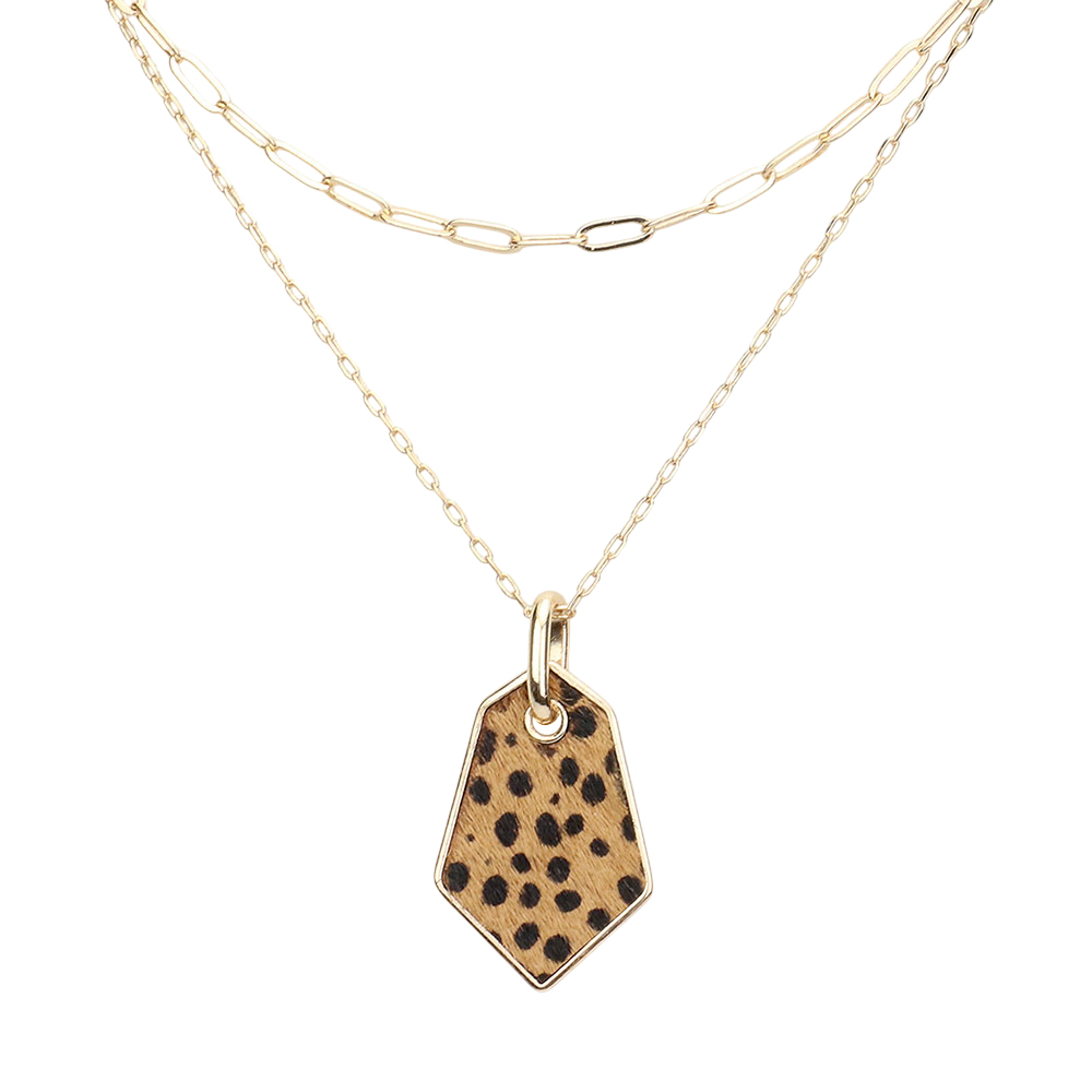 Cheetah Patterned Genuine Leather Angled Pendant Double Layered Necklace