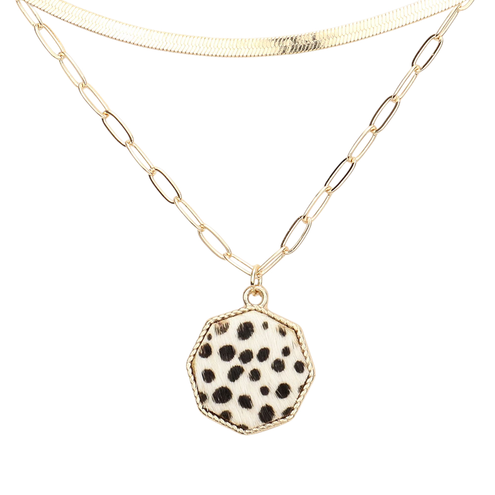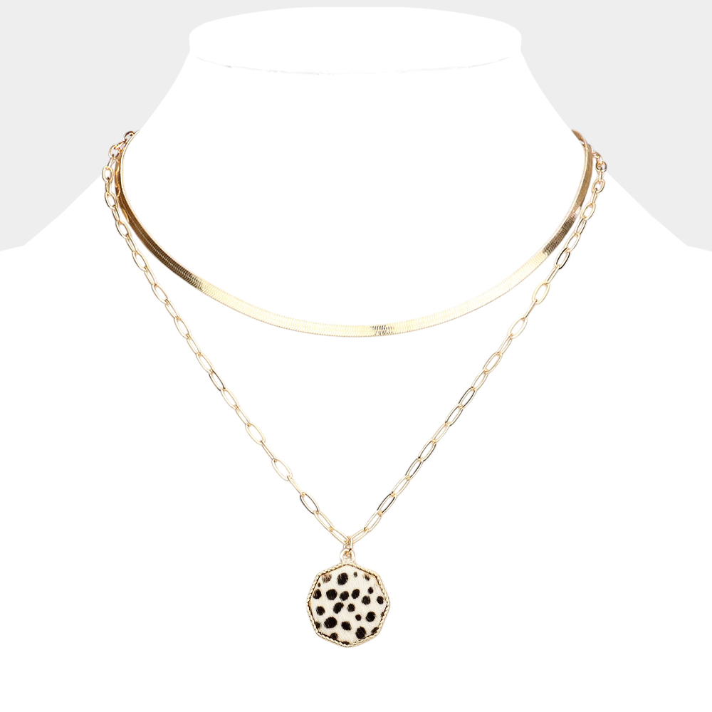Cheetah Patterned Genuine Leather Octagon Pendant Double Layered Necklace