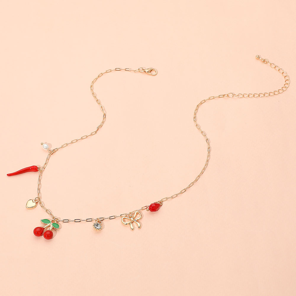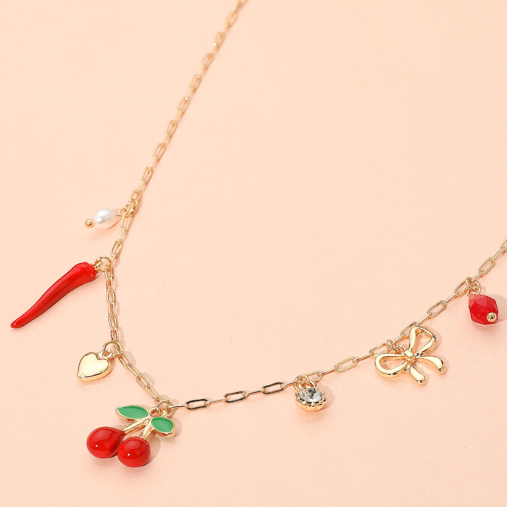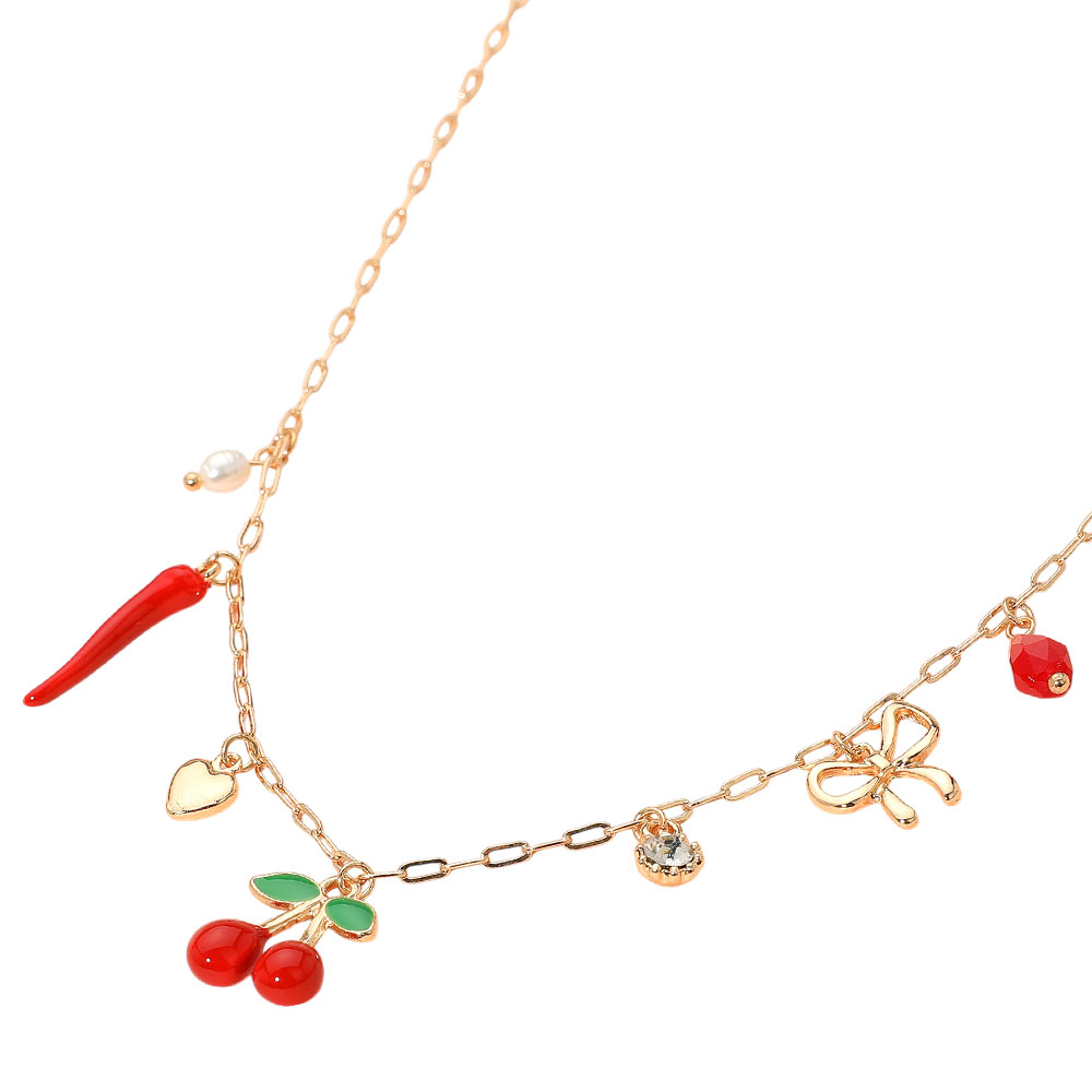 Details • Necklace Size : 16" + 3.5" L • Decor Size : 1.2" L • Delicate charm necklace adorned with cherries, heart, bow, and other playful elements. A stylish accessory perfect for everyday wear or a fun, flirty outfit accent. • Lead and Nickel Compliant
