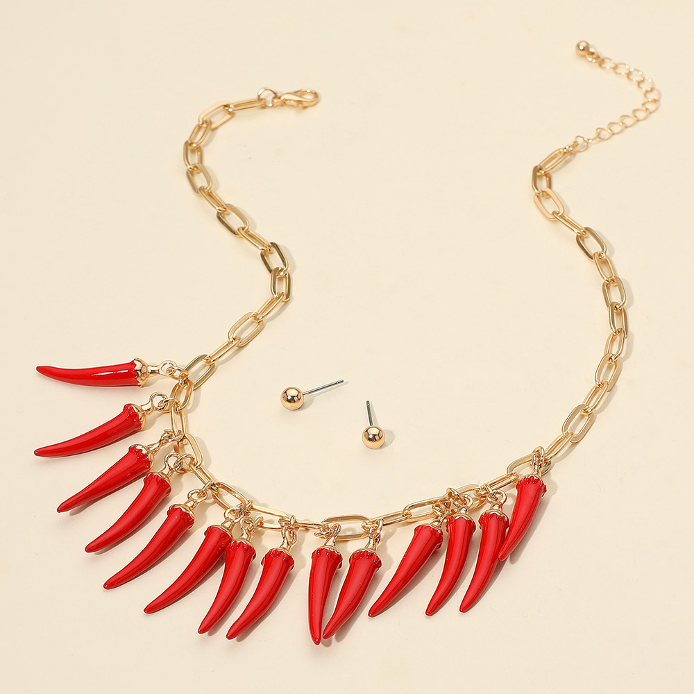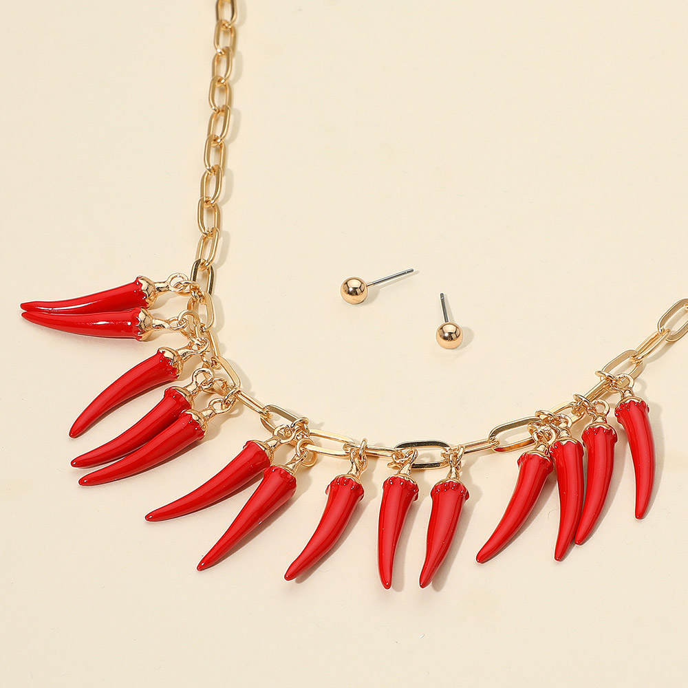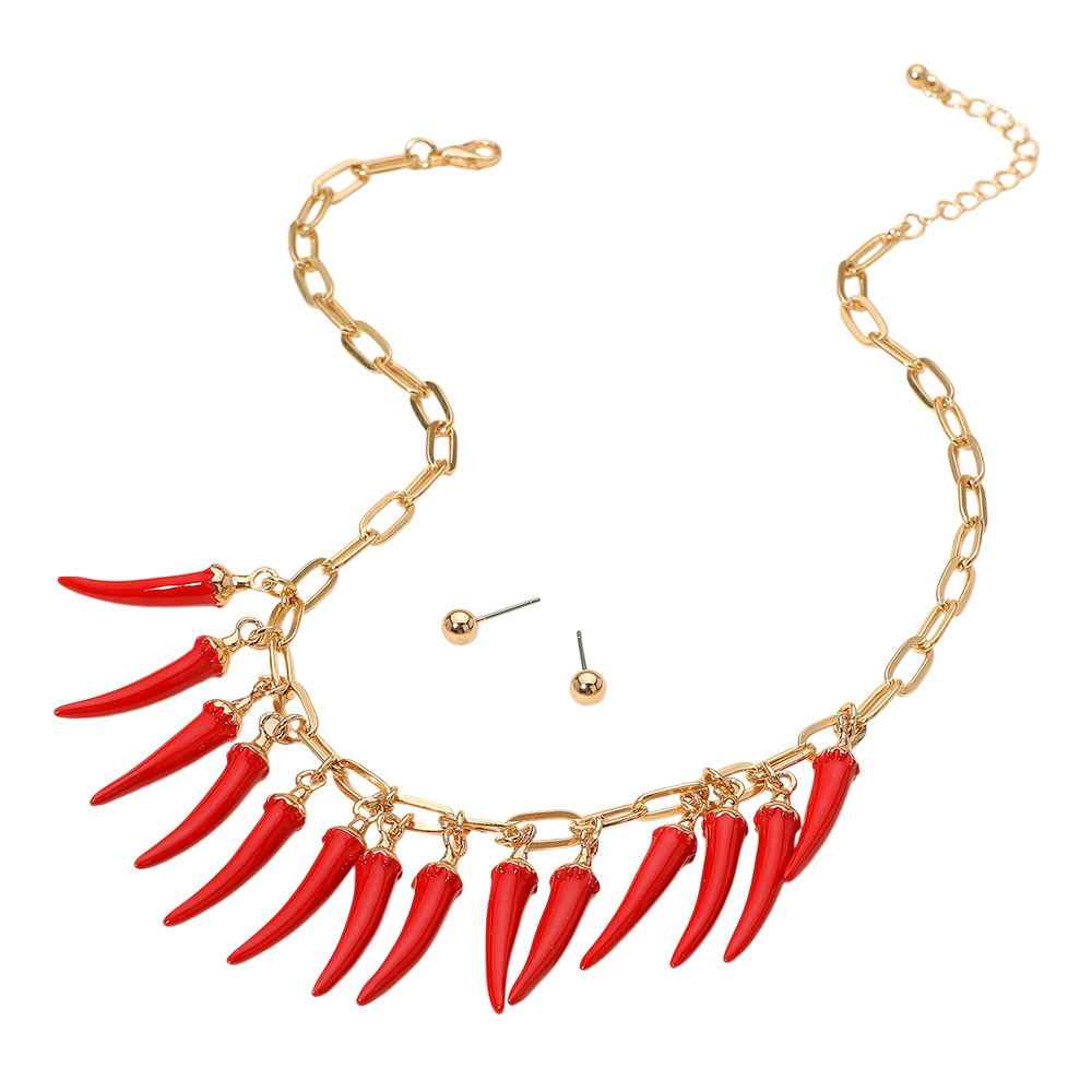 Details • Necklace Size : 14.5" + 2" L • Decor Size : 2" L • Earrings Size : 0.2" L • Bold and daring, this statement necklace features a row of chili horn pendants on a chunky chain. Comes with matching stud earrings for a complete, fiery look that adds edge and flair to any outfit. • Lead and Nickel Compliant