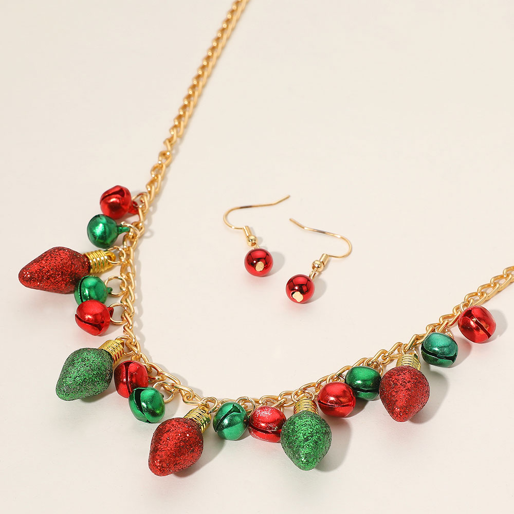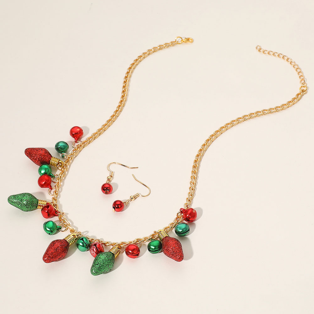Details • Necklace Size : 18" + 2.5" L • Decor Size : 1.25" L • Earring Size : 1.25" L • Light up your look with this festive Christmas necklace and earring set, featuring glittery red and green bulb charms and jingle bells on a gold-tone chain. Includes matching red bell drop earrings. Perfect for holiday parties, costumes, and seasonal gifting. • Lead and Nickel Compliant