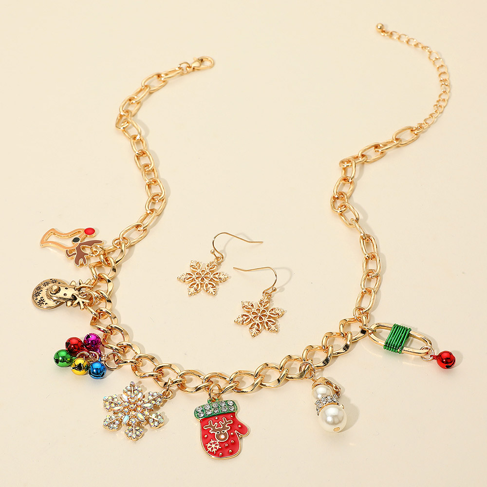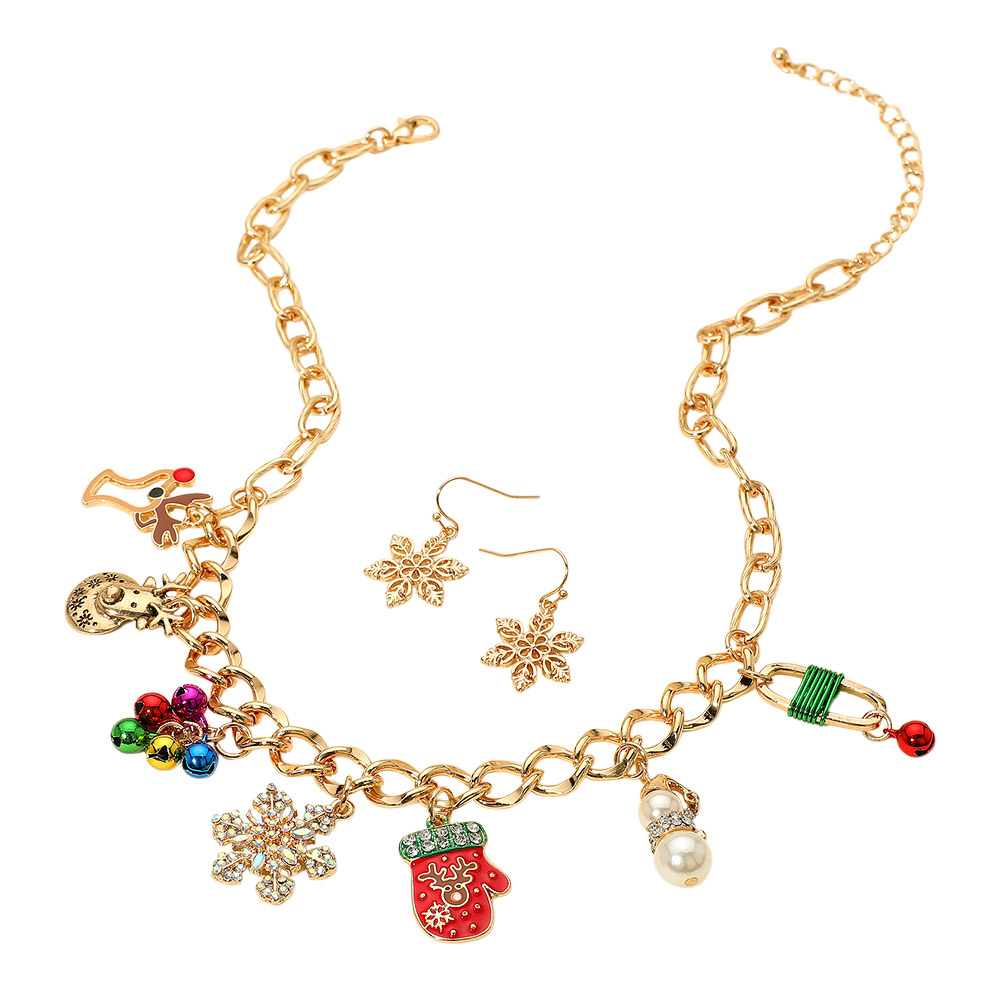Details • Necklace Size : 17.5" + 3" L • Decor Size : 1.6" L • Earrings Size : 1.25" L • Holiday necklace featuring festive charms like mittens, bells, snowflakes, and reindeer. Comes with matching snowflake earrings. A cheerful accessory for seasonal events or gifting. • Lead and Nickel Compliant