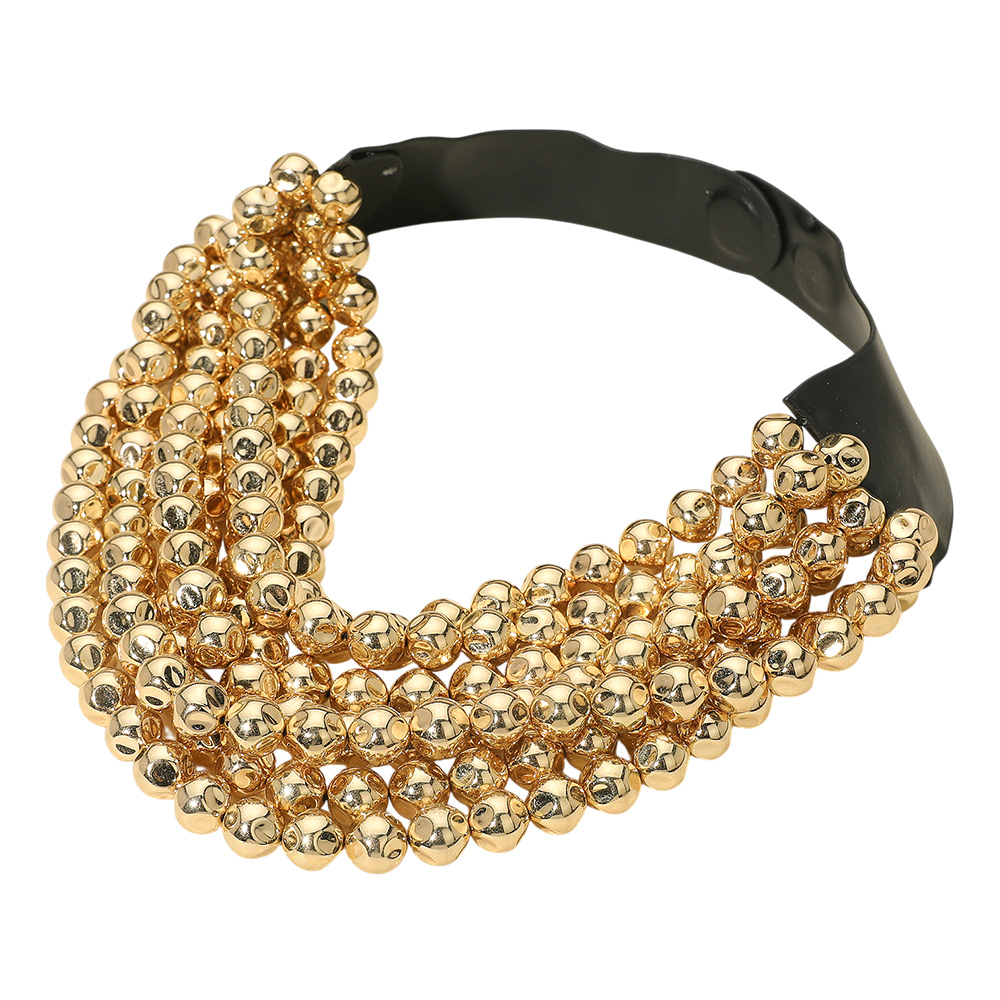 • Elevate your style with this multi-strand beaded necklace featuring faceted round beads and a wide neck band. A perfect blend of sophistication and bold design for standout occasions.