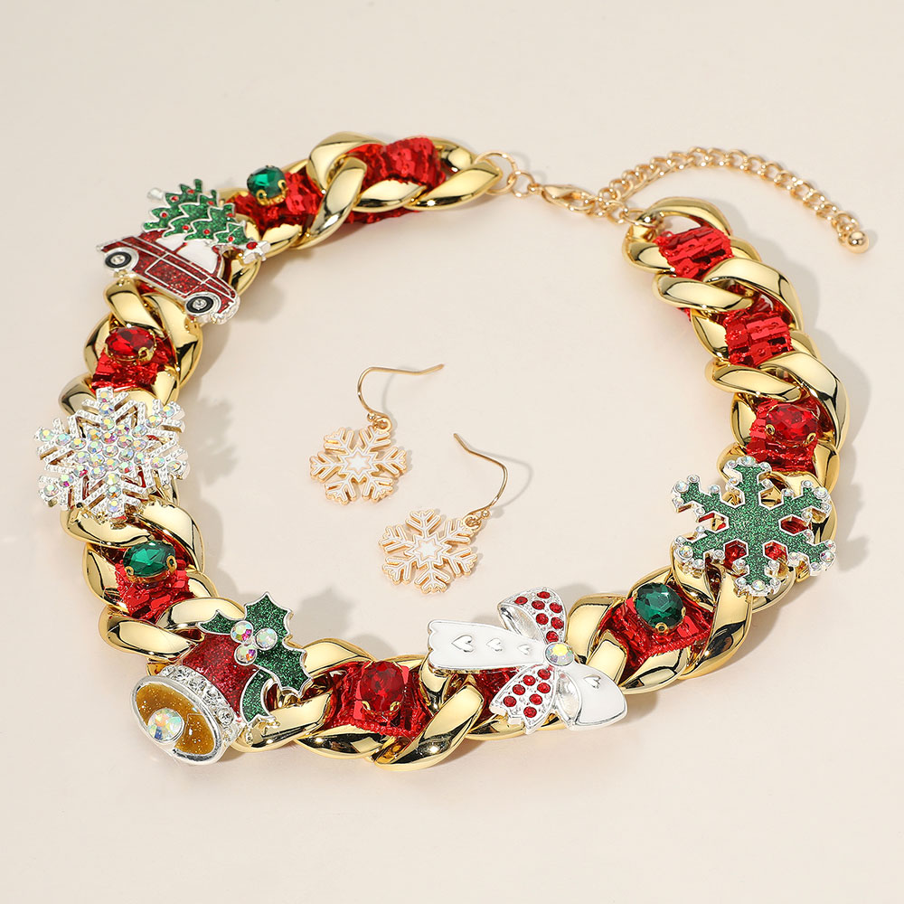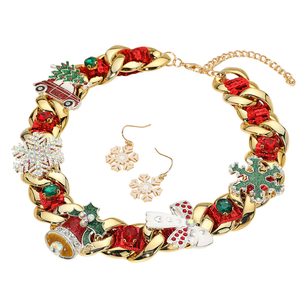 Details • Necklace Size : 18" + 2.5" L • Decor Size : 1.25" L • Earring Size : 1.25" L • Make a bold festive statement with this chunky gold Christmas necklace and earring set featuring red ribbon weaving, holiday-themed charms (Santa hat, tree, snowflakes, mittens, wreath, and more), and matching snowflake drop earrings. Perfect for parties, gifting, or holiday outfits. • Lead and Nickel Compliant
