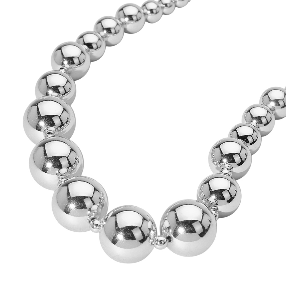 • This graduated bead necklace features a series of smooth, reflective spheres that increase in size toward the center, creating a bold and balanced silhouette. With a sleek, polished finish, it adds a touch of modern elegance to both casual and formal ensembles.