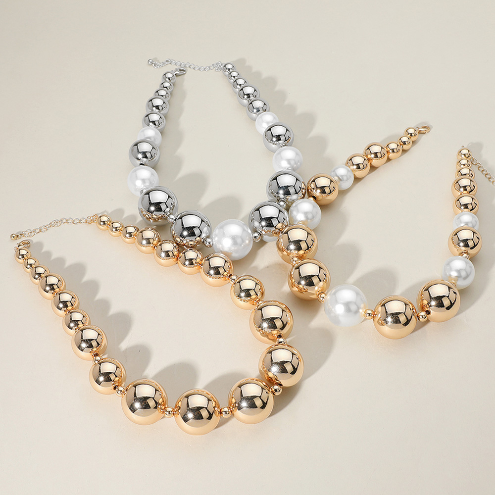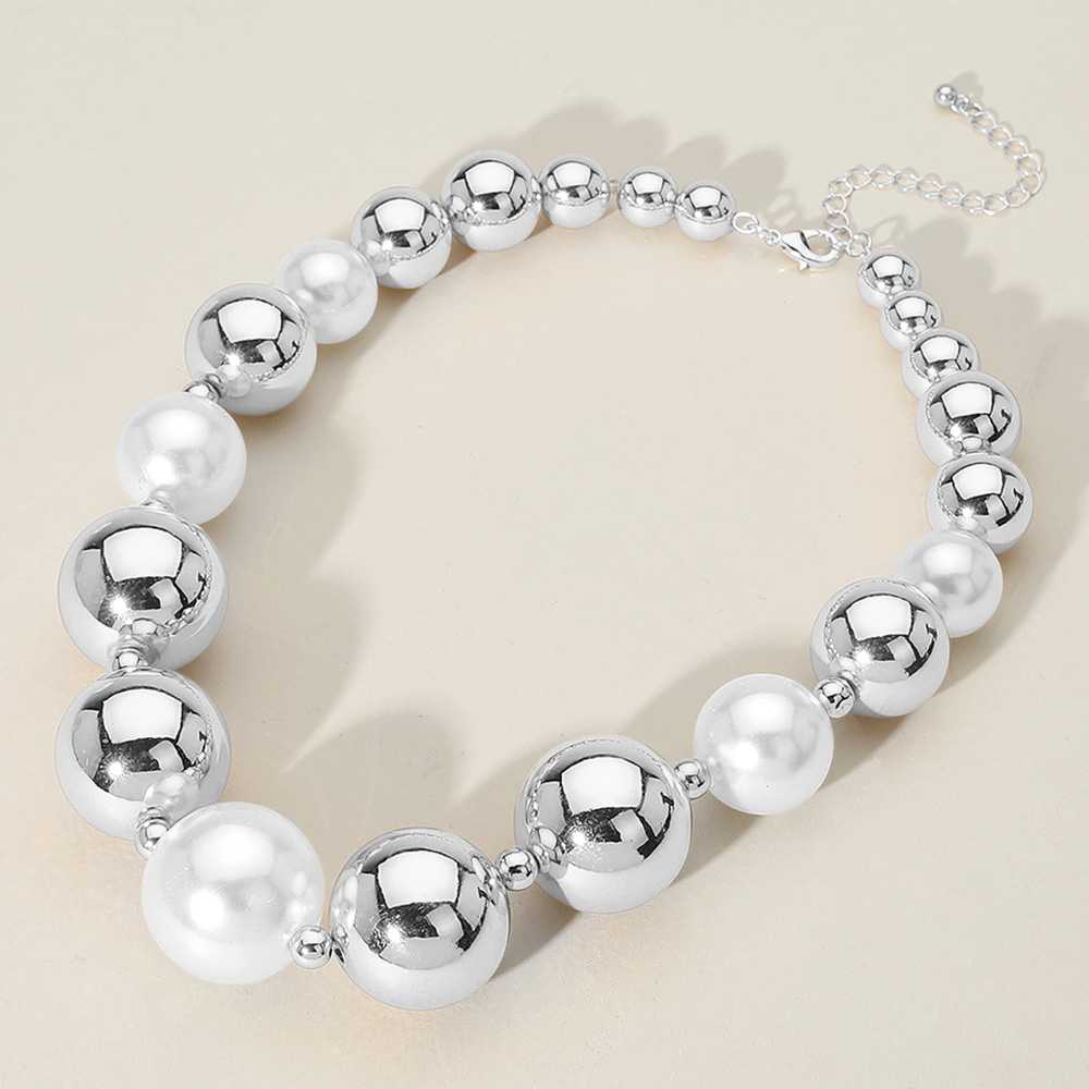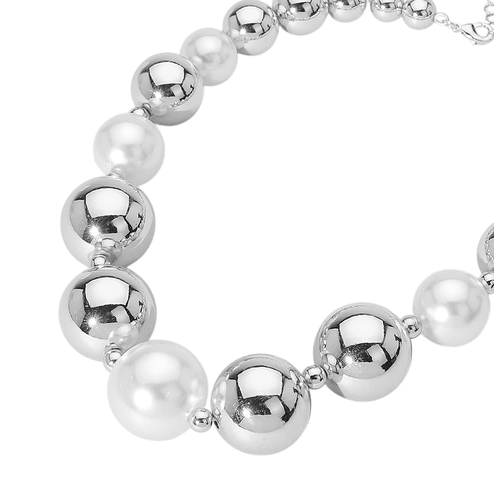 Details • Necklace Size : 16.5" + 3.25" L • Decor Size : 1" L • This mixed bead statement necklace blends high-gloss and lustrous spheres in a graduated design for a sophisticated, eye-catching look. Its elegant contrast and bold silhouette make it a perfect choice for enhancing both formal attire and upscale everyday ensembles. • Lead and Nickel Compliant