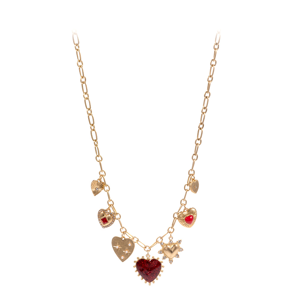 Chunky Mixed Heart Charm Station Paperclip Chain Necklace