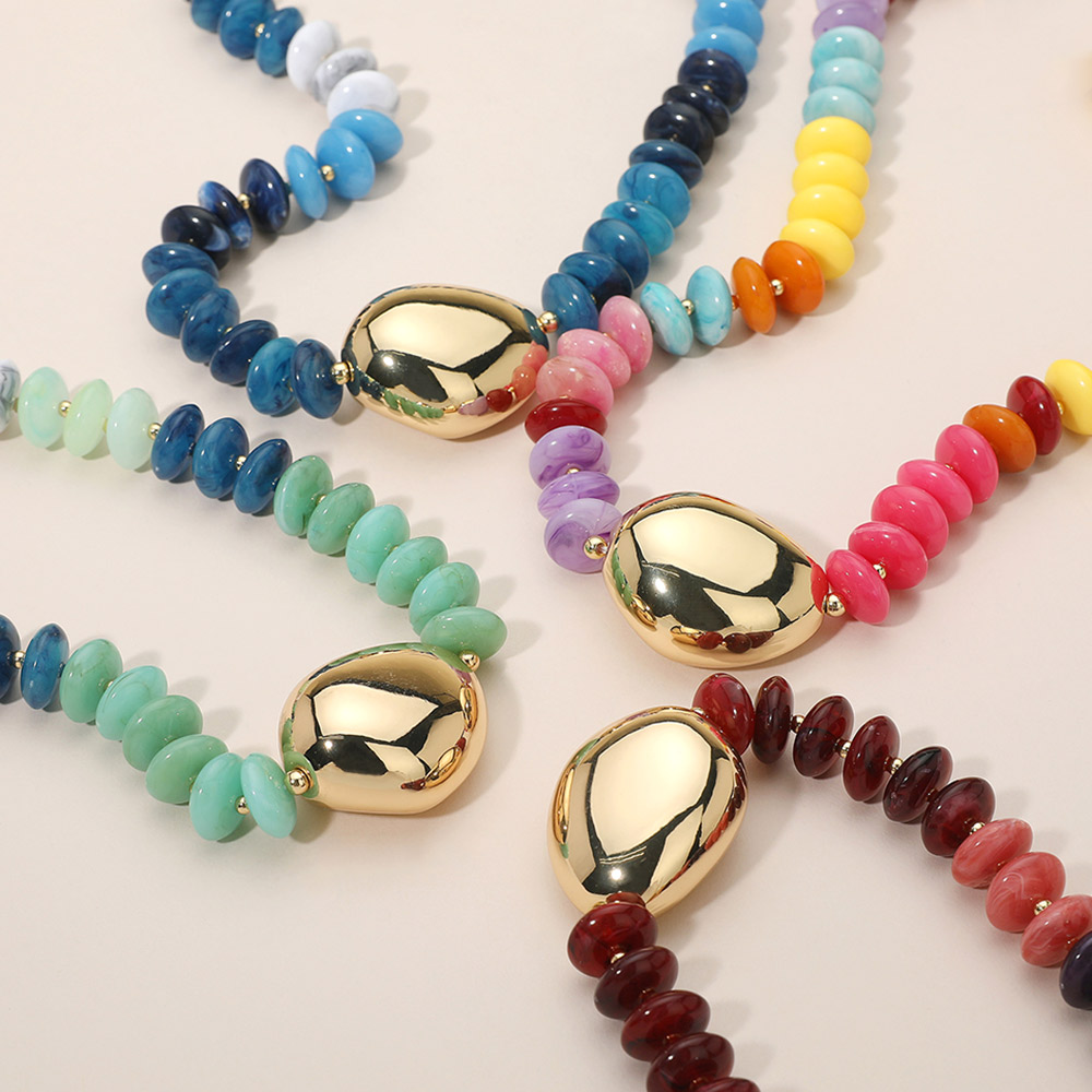 Details • Necklace Size : 18" + 3.25" L • Decor Size : 1.2" L • Eye-catching chunky necklace featuring polished beads in varied tones and a bold central pendant. Designed to elevate both casual and dressy looks, this statement piece brings modern style with a touch of elegance, making it the perfect accessory for layering or wearing solo. • Lead and Nickel Compliant