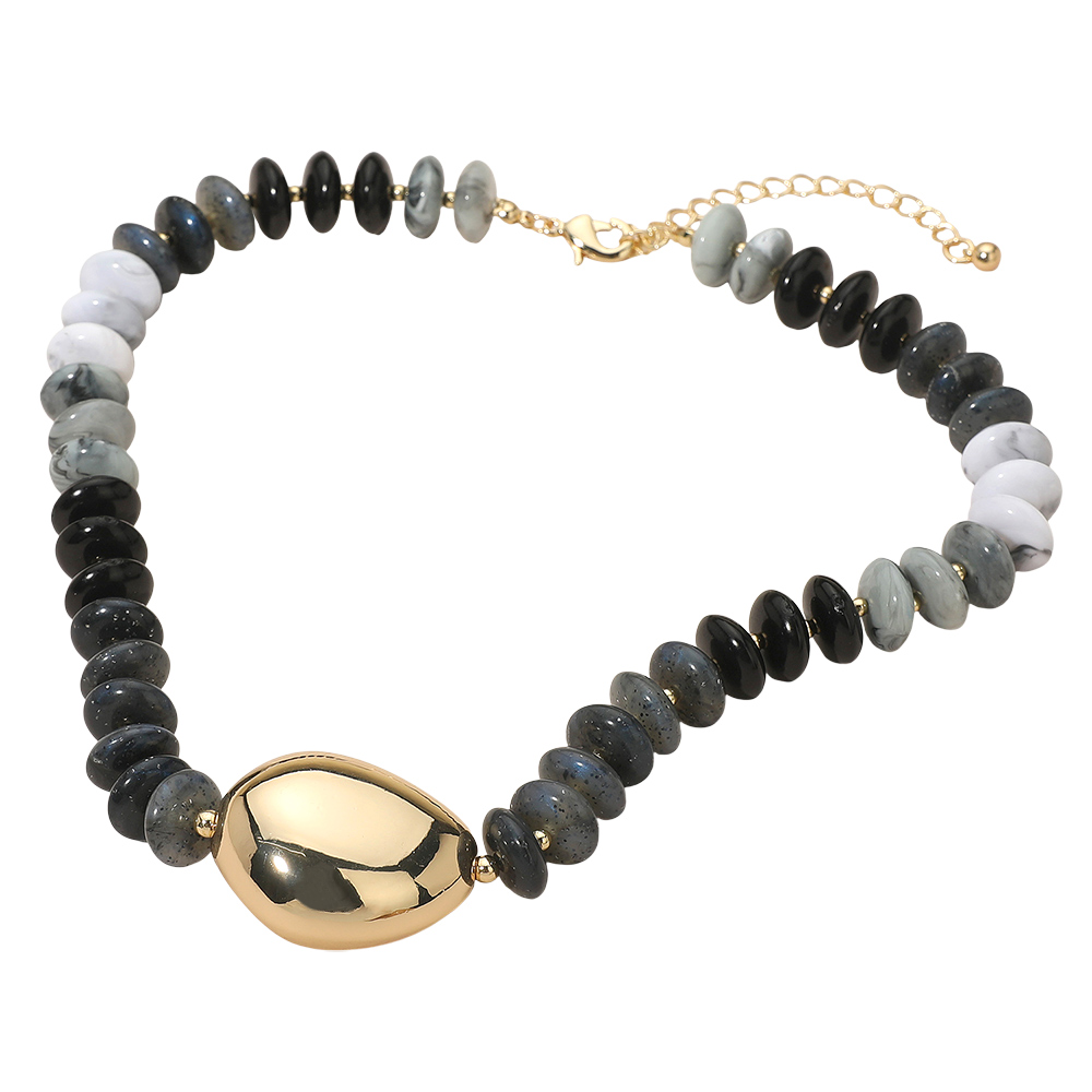 Details • Necklace Size : 18" + 3.25" L • Decor Size : 1.2" L • Eye-catching chunky necklace featuring polished beads in varied tones and a bold central pendant. Designed to elevate both casual and dressy looks, this statement piece brings modern style with a touch of elegance, making it the perfect accessory for layering or wearing solo. • Lead and Nickel Compliant