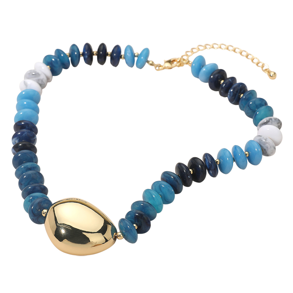 Details • Necklace Size : 18" + 3.25" L • Decor Size : 1.2" L • Eye-catching chunky necklace featuring polished beads in varied tones and a bold central pendant. Designed to elevate both casual and dressy looks, this statement piece brings modern style with a touch of elegance, making it the perfect accessory for layering or wearing solo. • Lead and Nickel Compliant