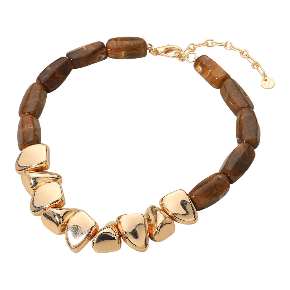 Details • Necklace Size : 16" + 3.75" L • Decor Size : 0.8" L • Bold and modern chunky beaded necklace featuring polished metal accents paired with smooth marbled beads. Designed with an adjustable clasp for comfort, this necklace brings a touch of natural elegance and contemporary style to any jewelry collection. • Lead and Nickel Compliant