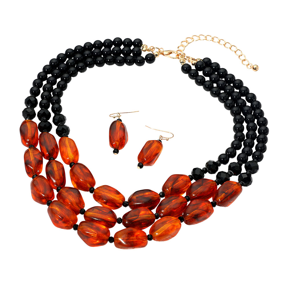 Details • Necklace Size : 16" + 3" L • Decor Size : 2" L • Earrings Size : 1.6" L • Stylish layered beaded necklace with matching earrings designed to elevate any look with its bold arrangement. Perfect for adding a touch of elegance to casual or dressy outfits, this coordinated set makes a standout addition to any jewelry collection. • Lead and Nickel Compliant