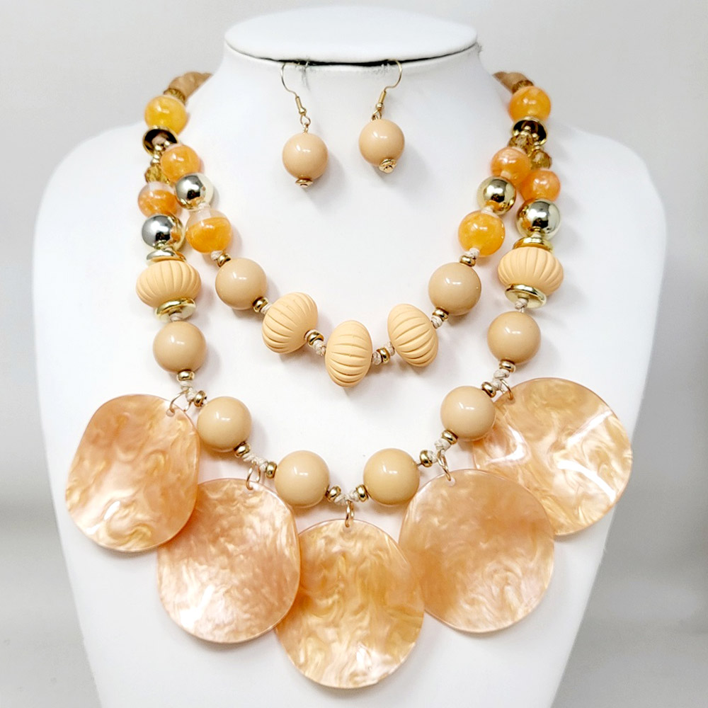 Details • Necklace Size : 20" + 3.25" L • Decor Size : 3.5" L • Earrings Size : 1.7" L • Three-layer statement necklace with a mix of round, ridged, and metallic beads, accented by large, textured pendants. Includes matching drop earrings for a complete look. A stylish, coordinated set perfect for elevating casual or dressy outfits with bold, sculptural charm. • Lead and Nickel Compliant