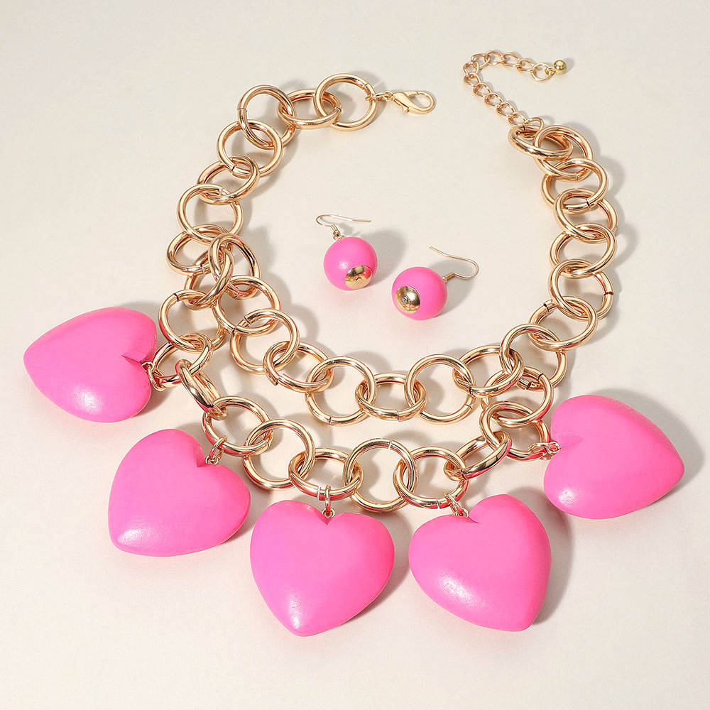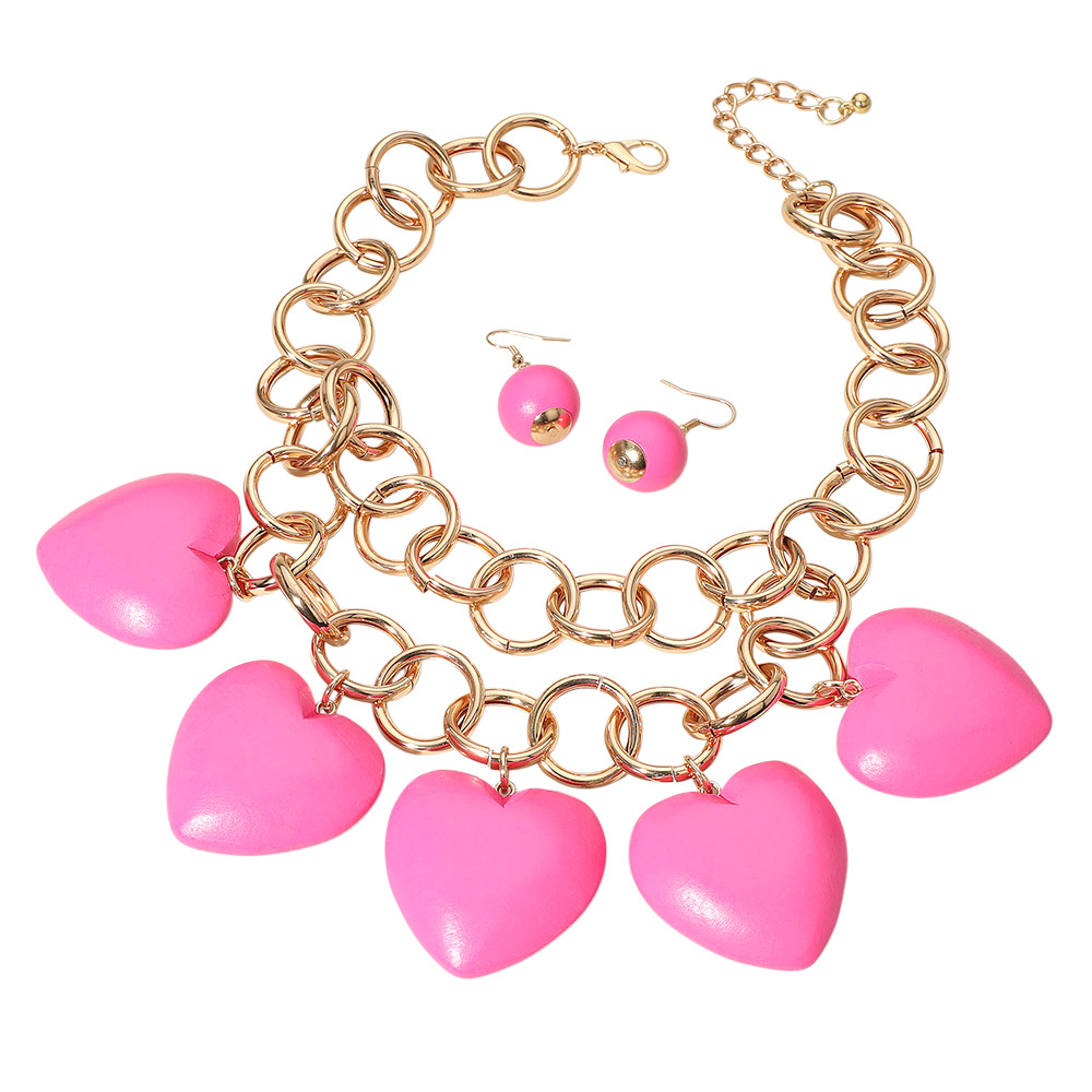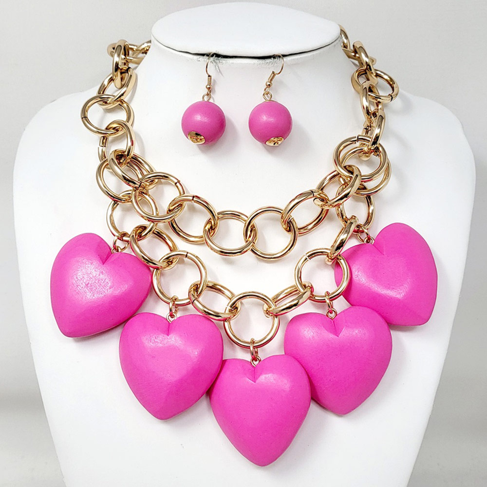 Chunky Wooden Heart Charm Station Layered Chain Necklace