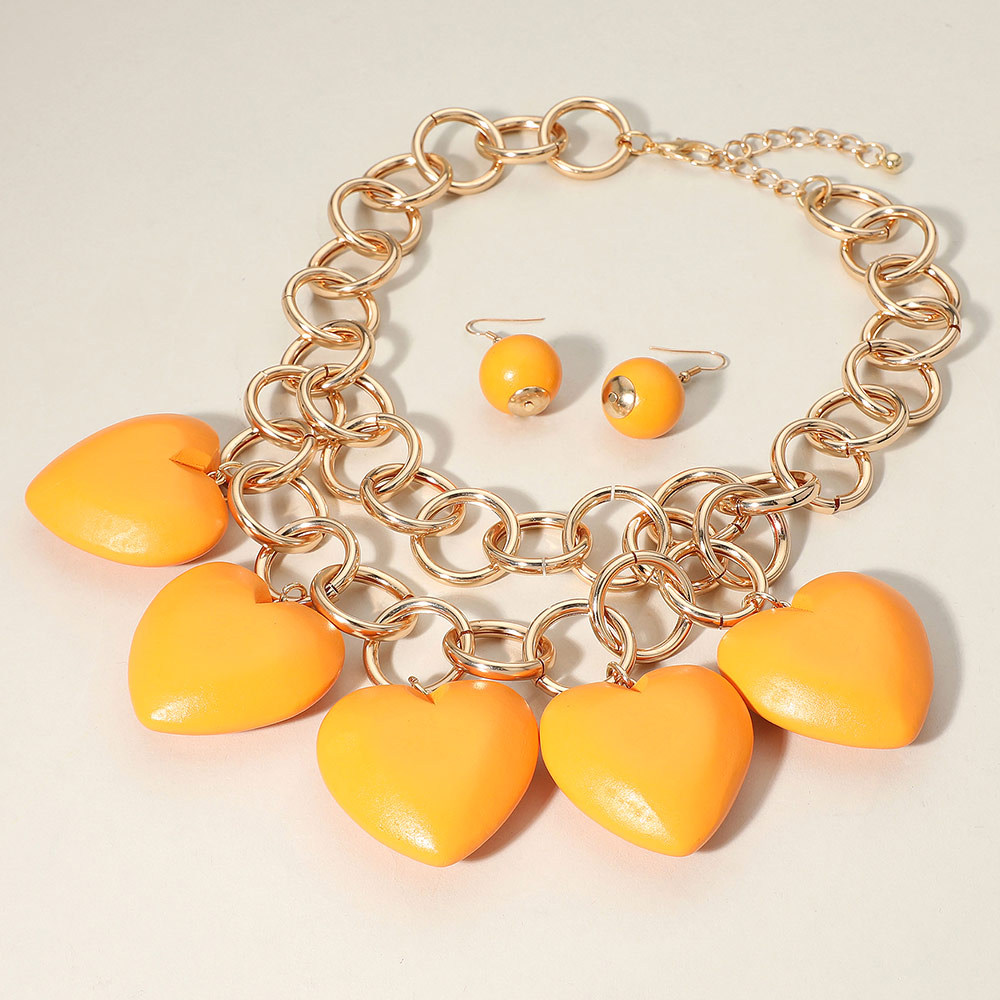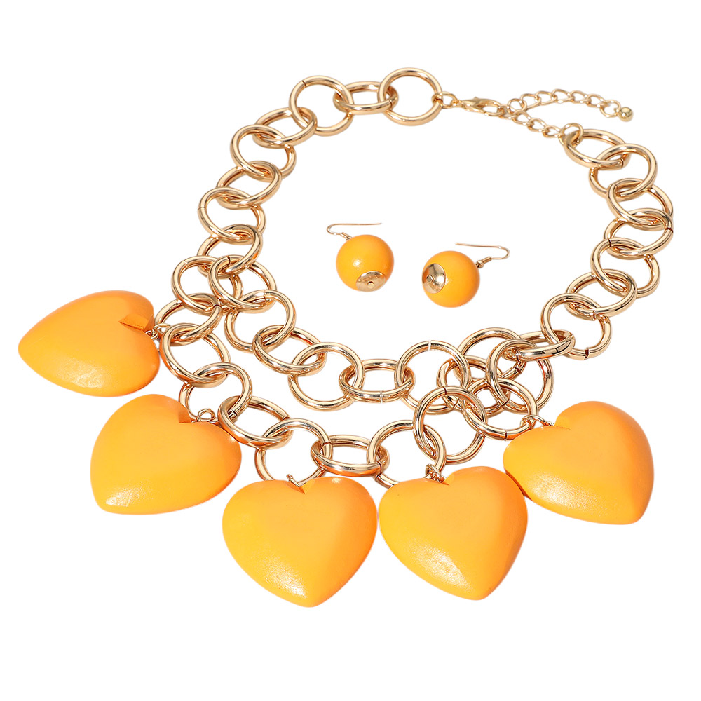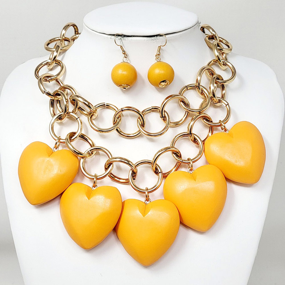Chunky Wooden Heart Charm Station Layered Chain Necklace