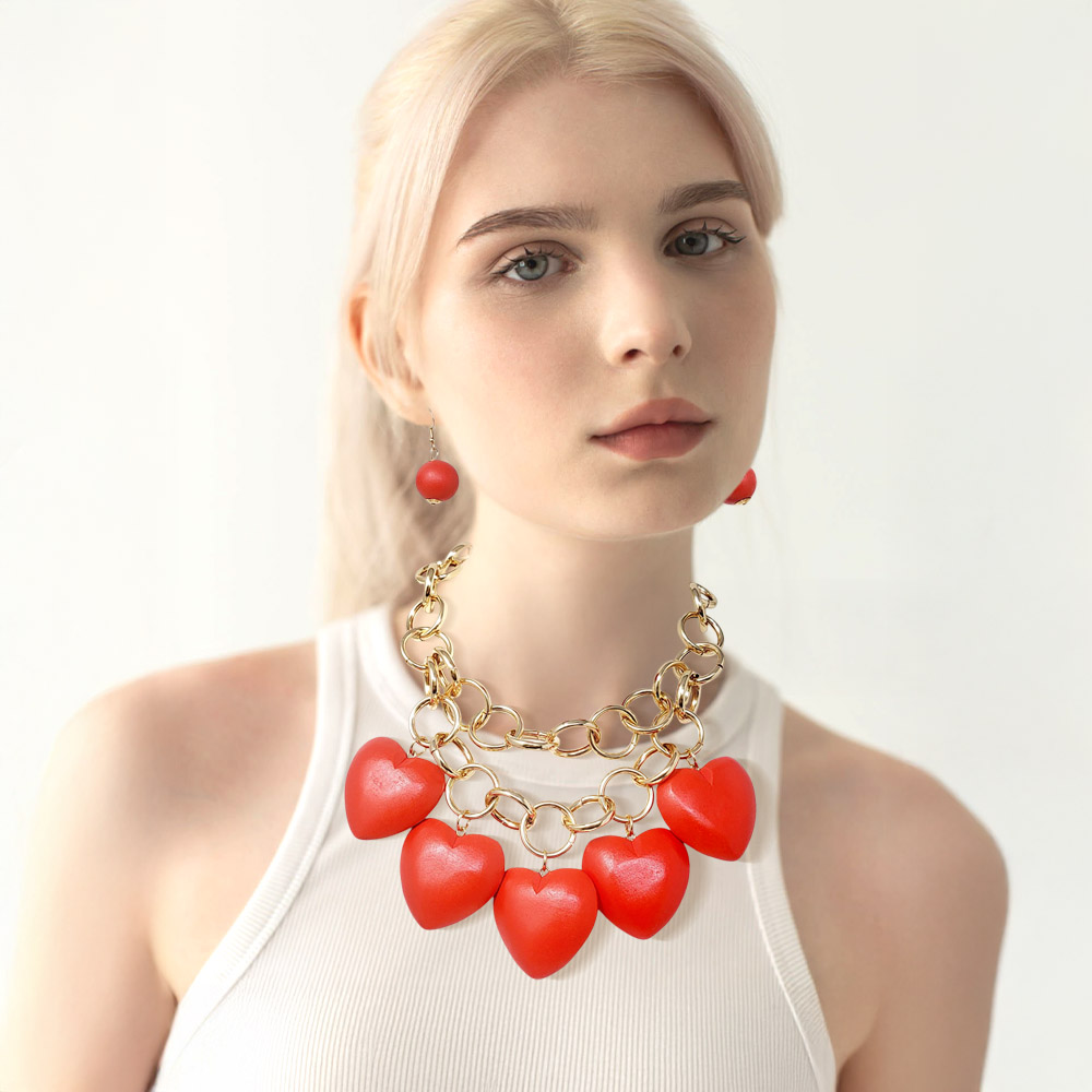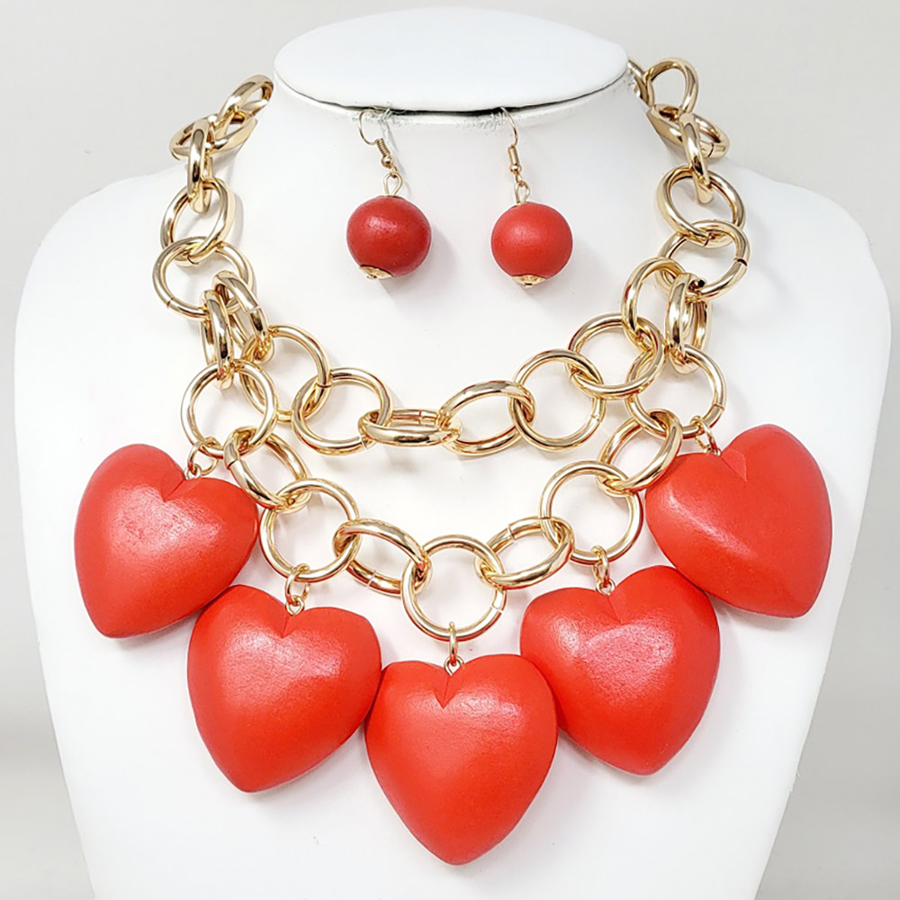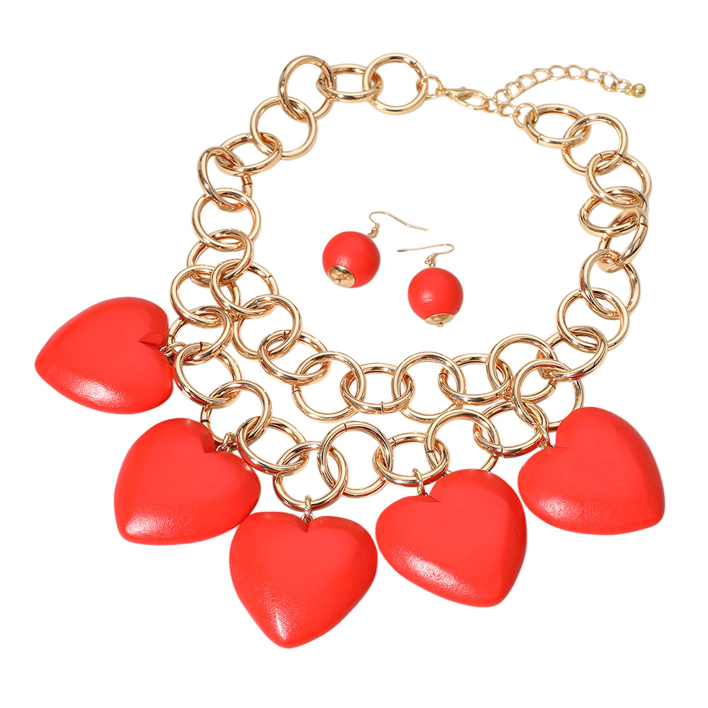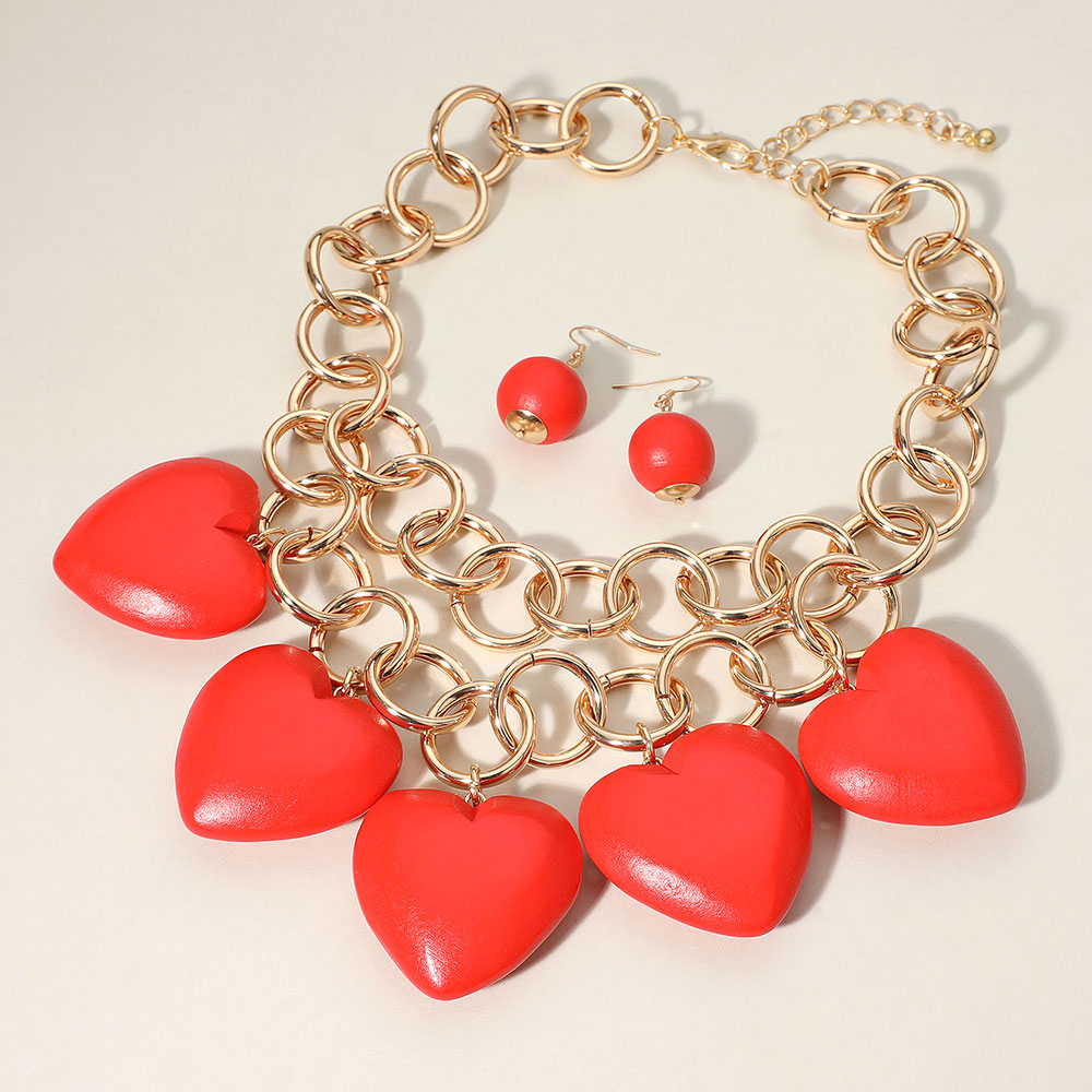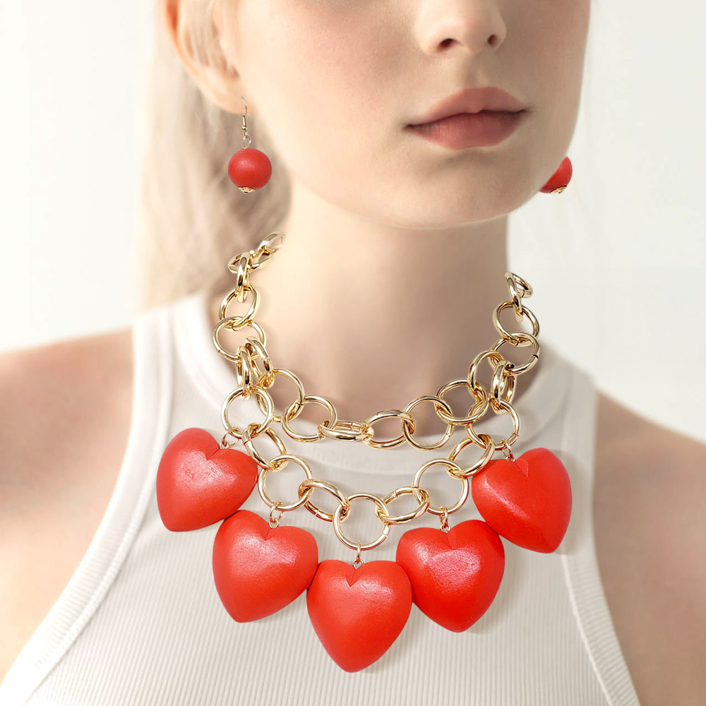 Chunky Wooden Heart Charm Station Layered Chain Necklace