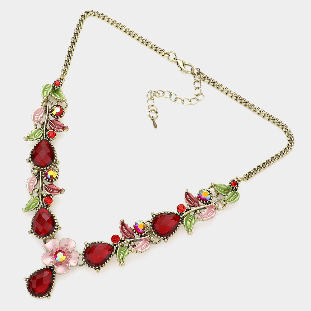 Colored Metal Flower Leaf Teardrop Stone Bib Necklace