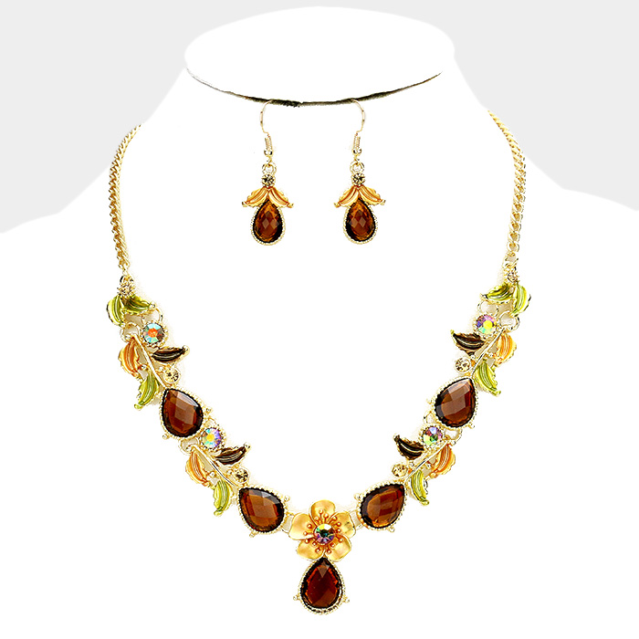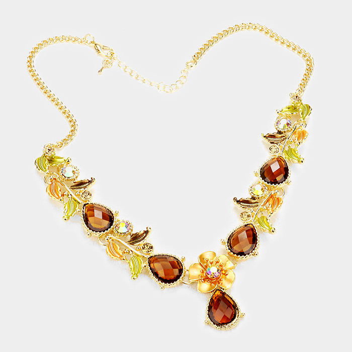 Colored Metal Flower Leaf Teardrop Stone Bib Necklace