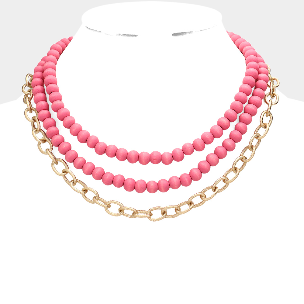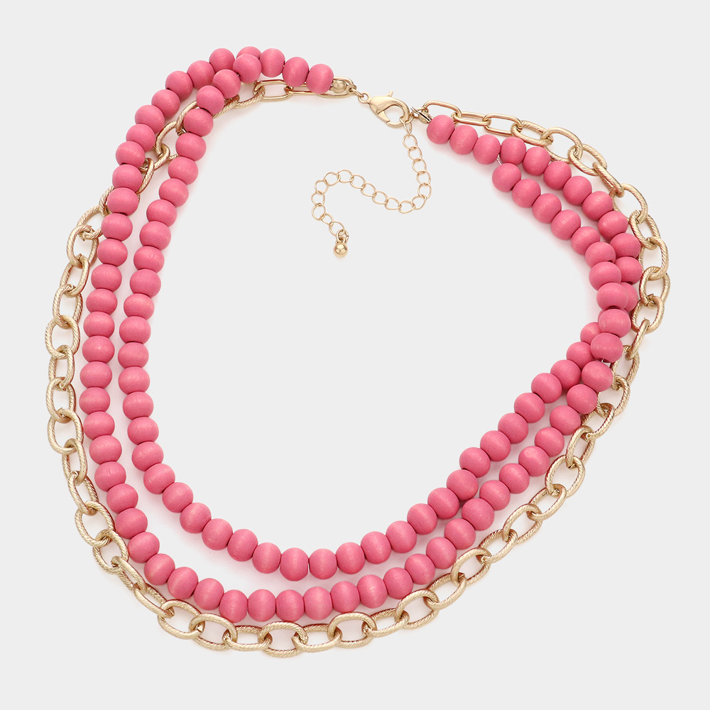 Colored Wood Open Metal Oval Link Triple Layered Necklace