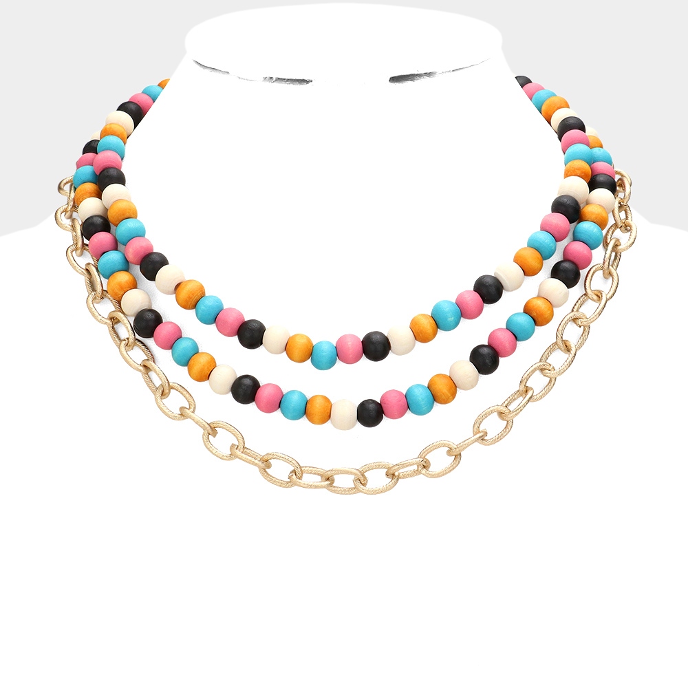 Colored Wood Open Metal Oval Link Triple Layered Necklace