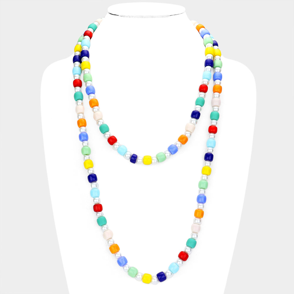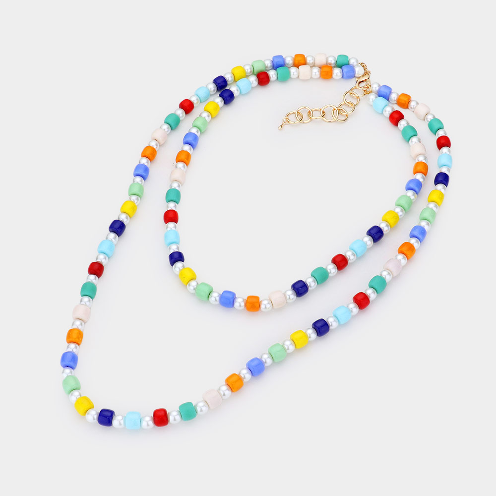 Colorful Bead Pointed Pearl Double Layered Bib Necklace
