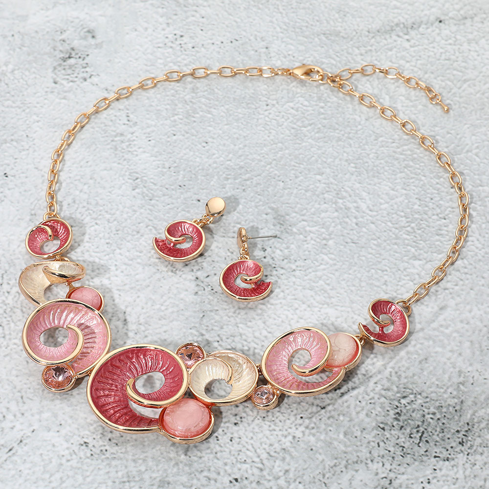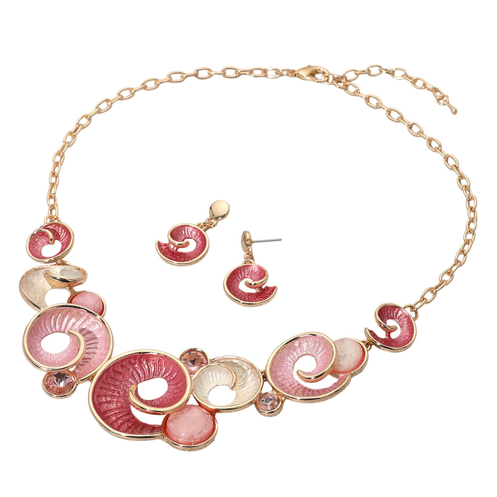 Details • Necklace Size : 17" + 2.75" L • Decor Size : 1.4" L • Earrings Size : 1.25" L • Bold statement necklace and earring set featuring vibrant swirl designs with gemstone accents. Perfect for adding artistic flair and unique style to both casual and dressy outfits. • Lead and Nickel Compliant