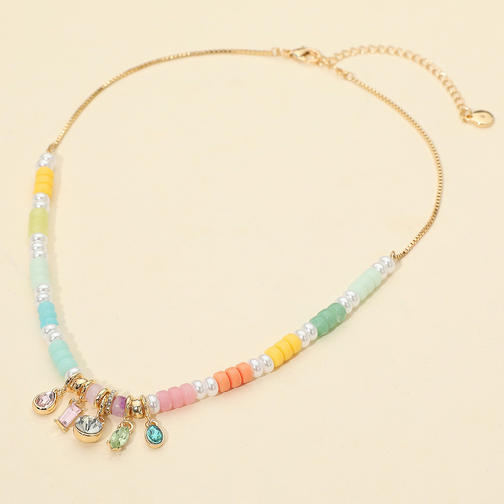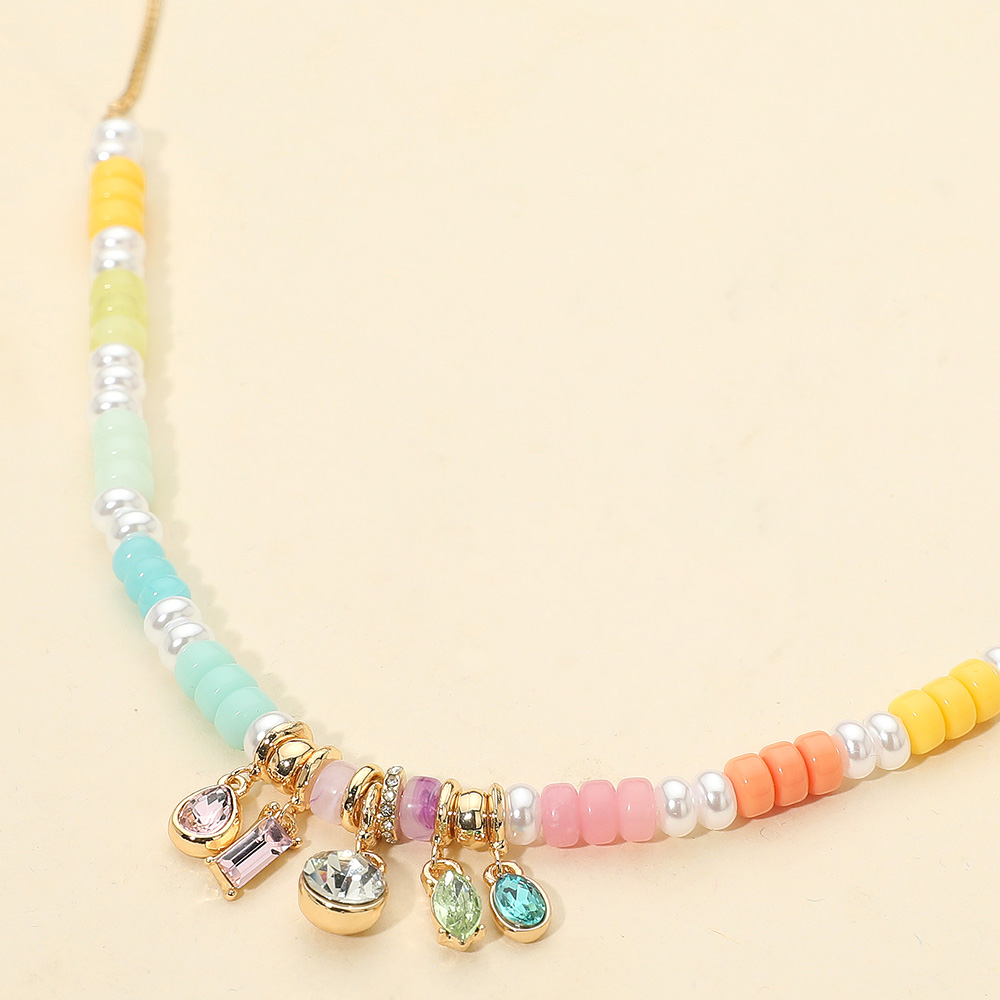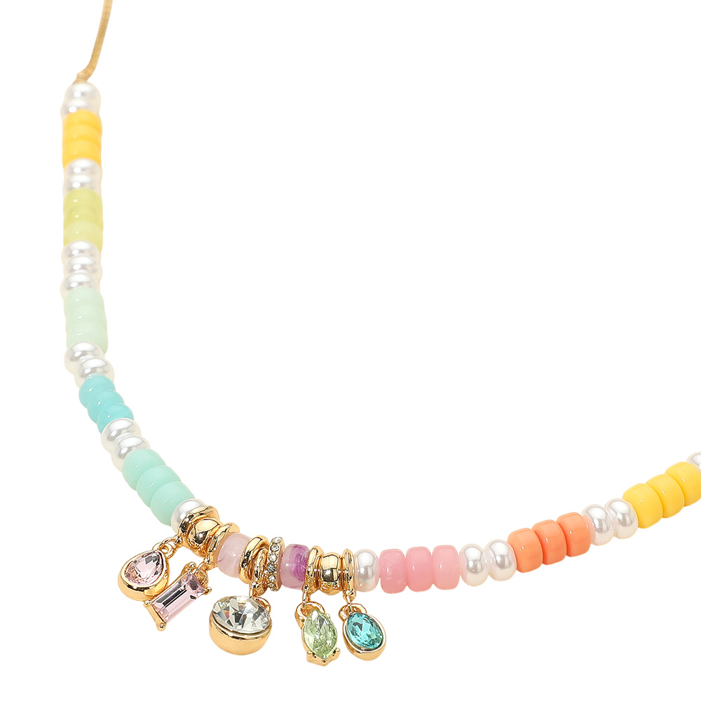 Details • Necklace Size : 16" + 3.5" L • Decor Size : 0.75" L • Brighten your look with this colorful beaded necklace featuring crystal charm accents for a touch of sparkle. Its playful yet elegant design adds personality and shine to any outfit, making it perfect for layering or wearing solo for a vibrant, modern statement. • Lead and Nickel Compliant