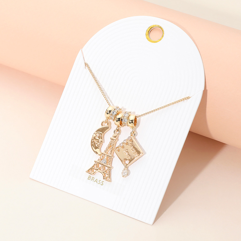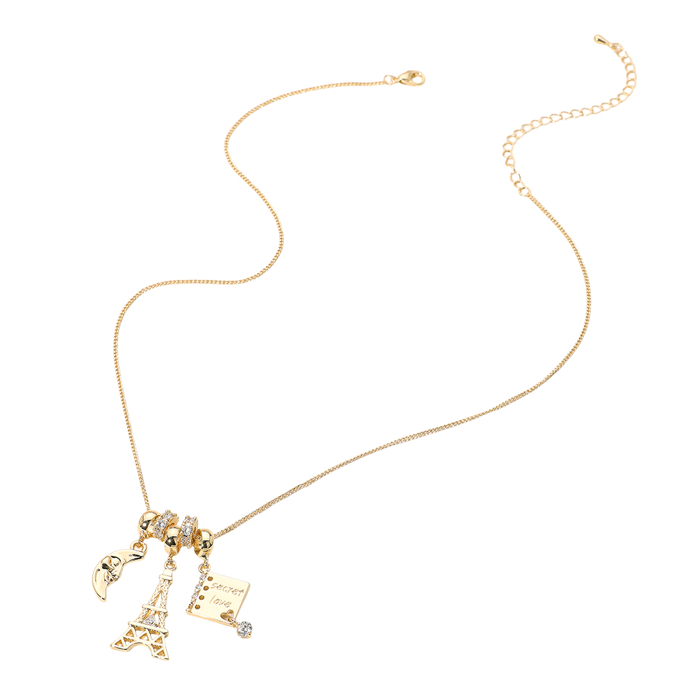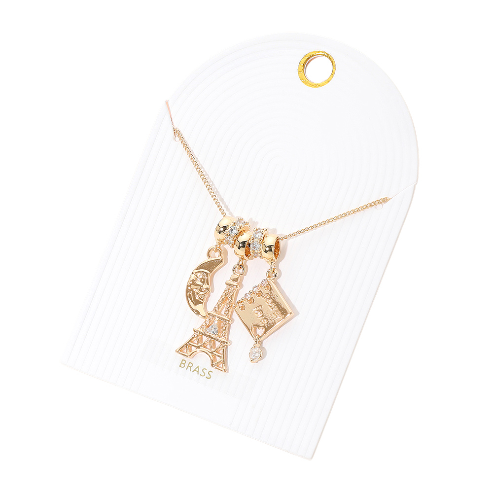 Details • Necklace Size : 16" + 3.25" L • Decor Size : 1.3" L • Stylish necklace featuring iconic charms including the Eiffel Tower and a handbag, accented with crystal details on a sleek chain. A playful piece that adds a touch of travel-inspired elegance and personality to any look. Great for everyday wear or as a chic gift idea. • Lead and Nickel Compliant • Brass