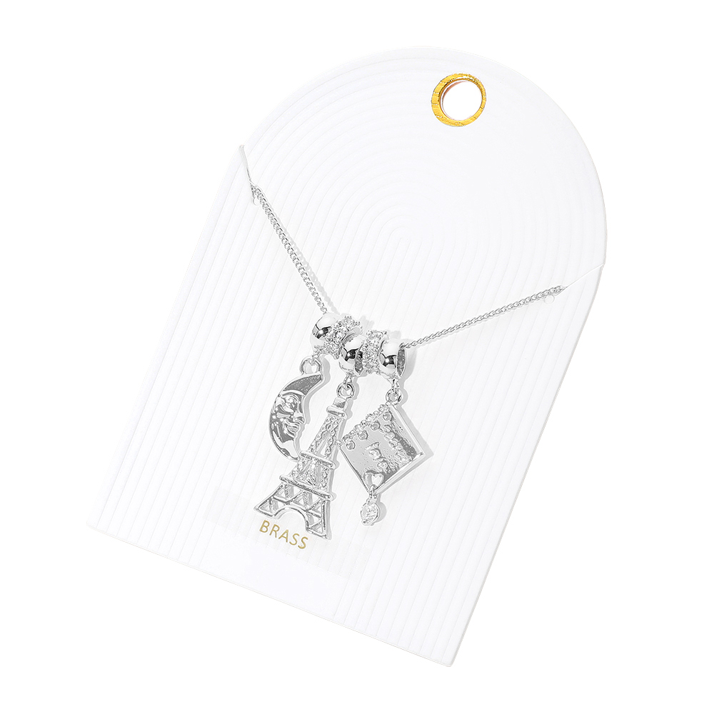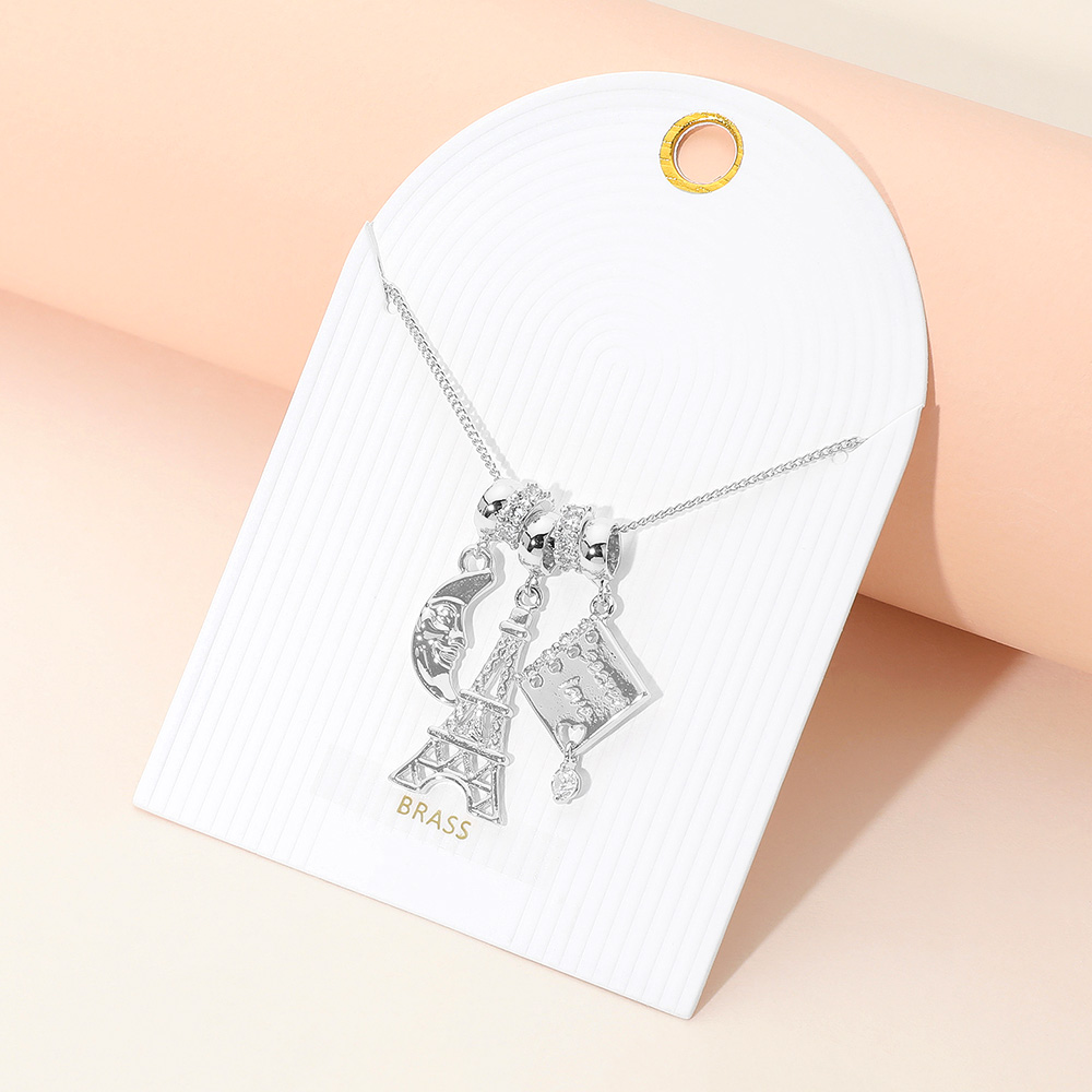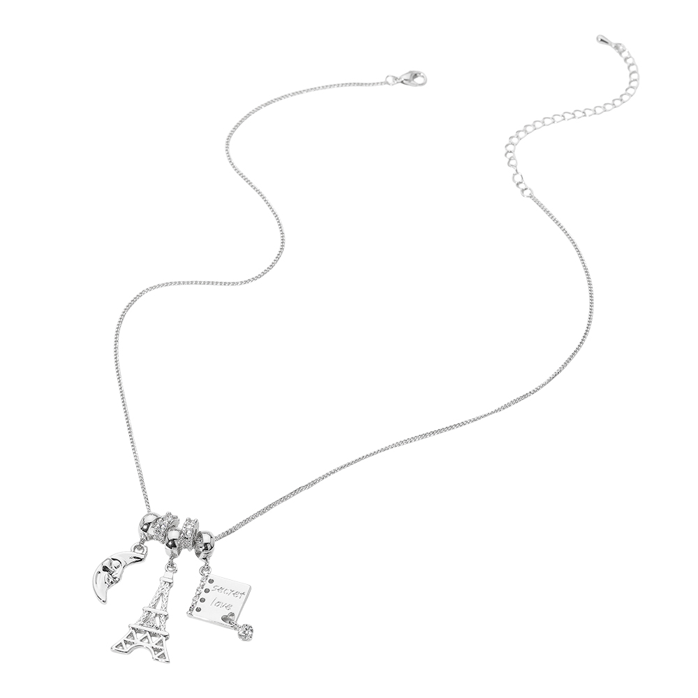 Details • Necklace Size : 16" + 3.25" L • Decor Size : 1.3" L • Stylish necklace featuring iconic charms including the Eiffel Tower and a handbag, accented with crystal details on a sleek chain. A playful piece that adds a touch of travel-inspired elegance and personality to any look. Great for everyday wear or as a chic gift idea. • Lead and Nickel Compliant • Brass