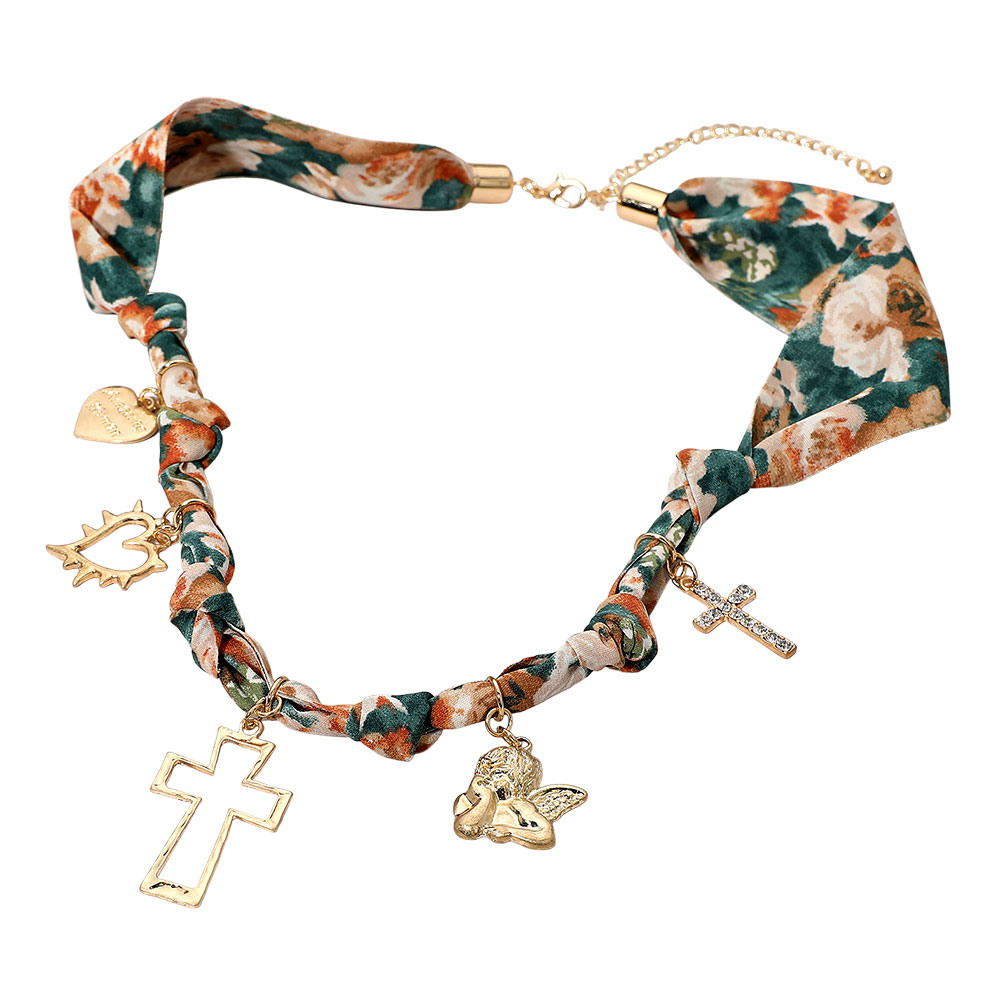 Details • Necklace Size : 18" + 3" L • Decor Size : 2" L • Print may vary • Bring artistic flair to your accessories with this floral fabric necklace adorned with assorted charms. Its braided design and adjustable clasp make it both unique and versatile, adding a stylish, bohemian-inspired touch to casual or dressy looks effortlessly. • Lead and Nickel Compliant
