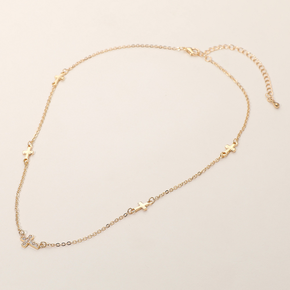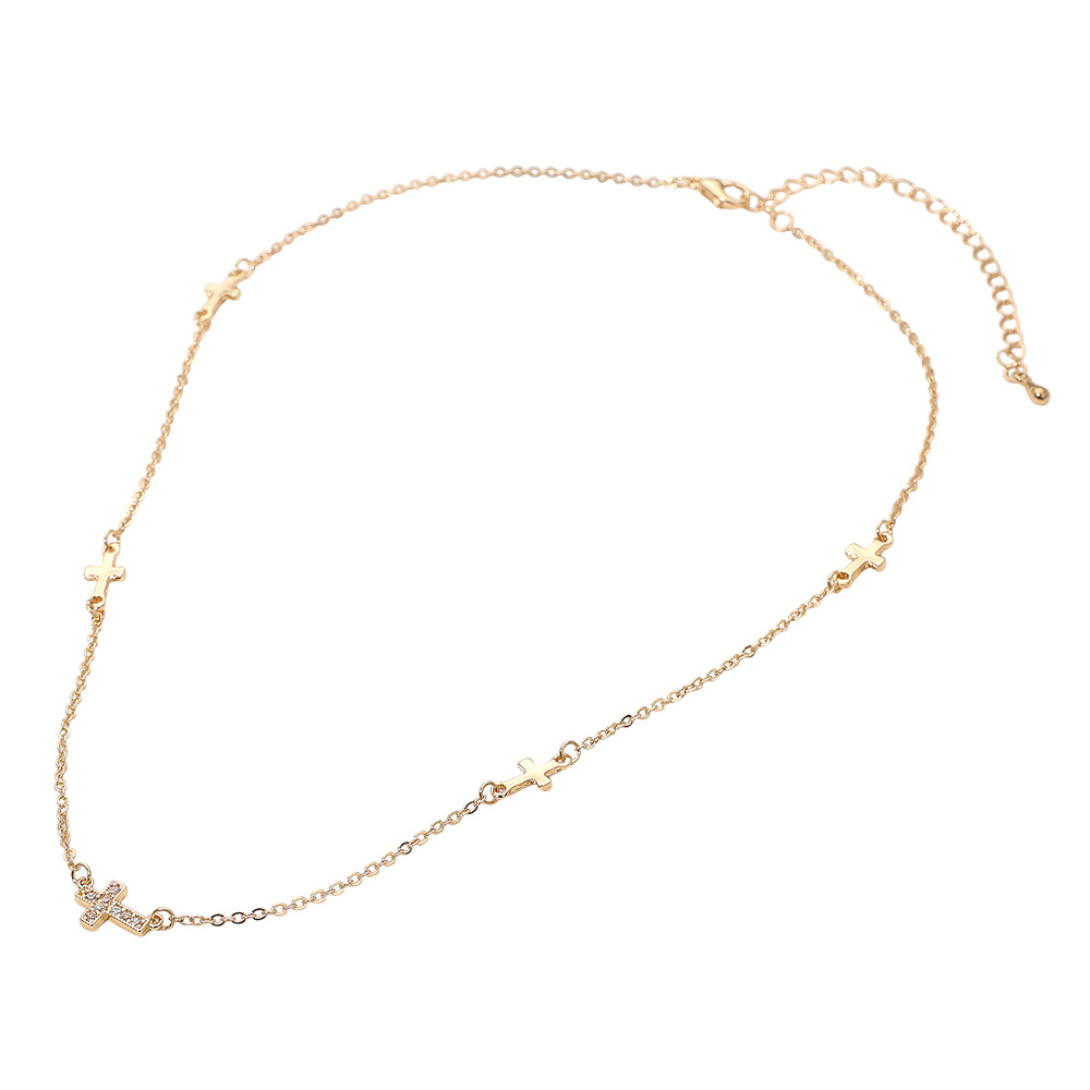 Details • Necklace Size : 16" + 3.5" L • Decor Size : 0.2" L • Elegant chain necklace featuring small cross charms evenly spaced for a refined and graceful look. Perfect for layering or wearing solo, adding subtle sophistication to any outfit. A timeless jewelry piece that combines minimalist design with symbolic elegance and everyday charm. • Brass • Lead and Nickel Compliant