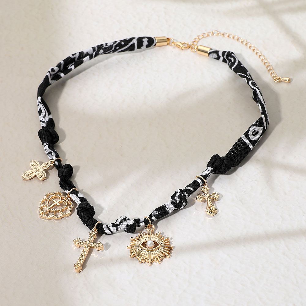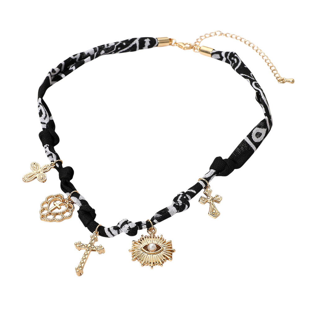 • Unique bandana necklace adorned with multiple symbolic charms including crosses, a heart, and an eye motif. Adjustable design offers a stylish statement accessory for layering or wearing solo, perfect for casual and festival-inspired looks.