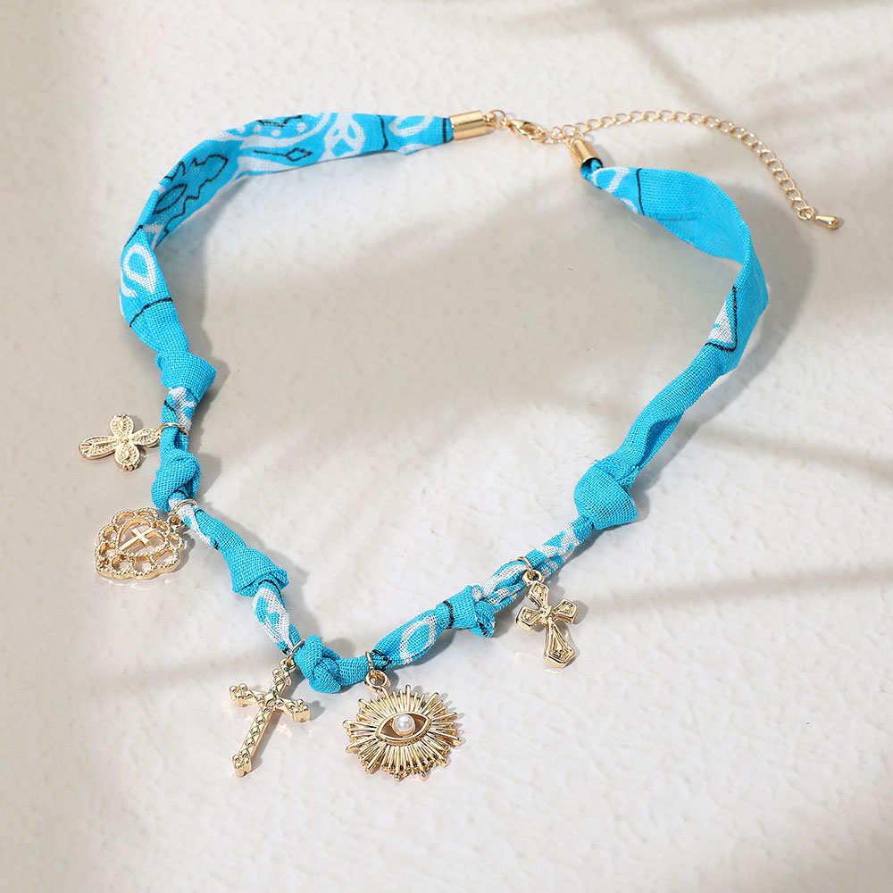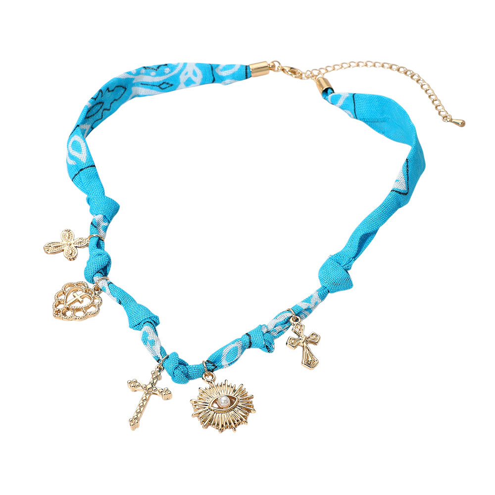 Details • Necklace Size : 16" + 3" L • Decor Size : 1.1" L • Unique bandana necklace adorned with multiple symbolic charms including crosses, a heart, and an eye motif. Adjustable design offers a stylish statement accessory for layering or wearing solo, perfect for casual and festival-inspired looks. • Lead and Nickel Compliant