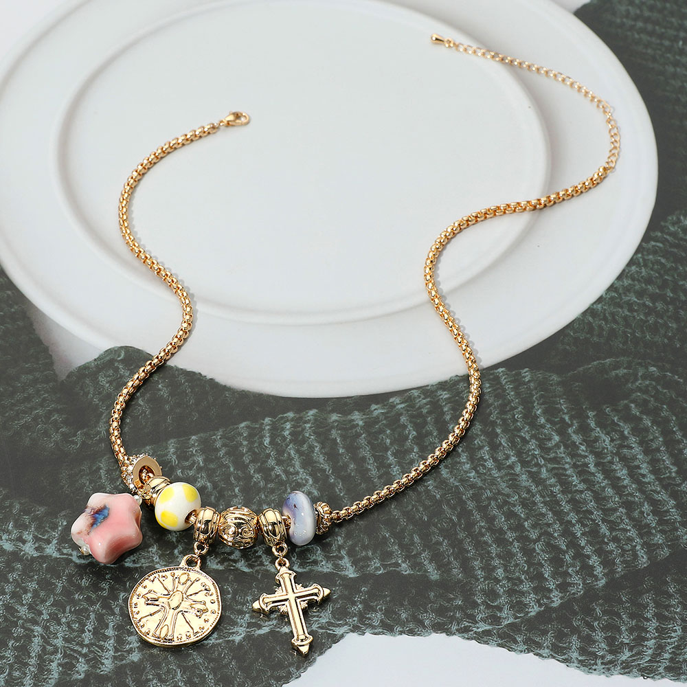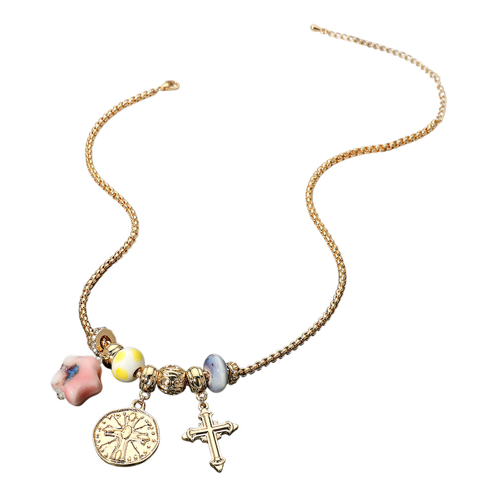 Details • Necklace Size : 16" + 3" L • Decor Size : 1.6" L • Stylish necklace featuring a medallion, cross charm, and colorful bead accents for a meaningful yet fashionable design. The adjustable chain ensures a comfortable fit, making it a perfect accessory for daily wear or as a thoughtful, symbolic gift. • Lead and Nickel Compliant
