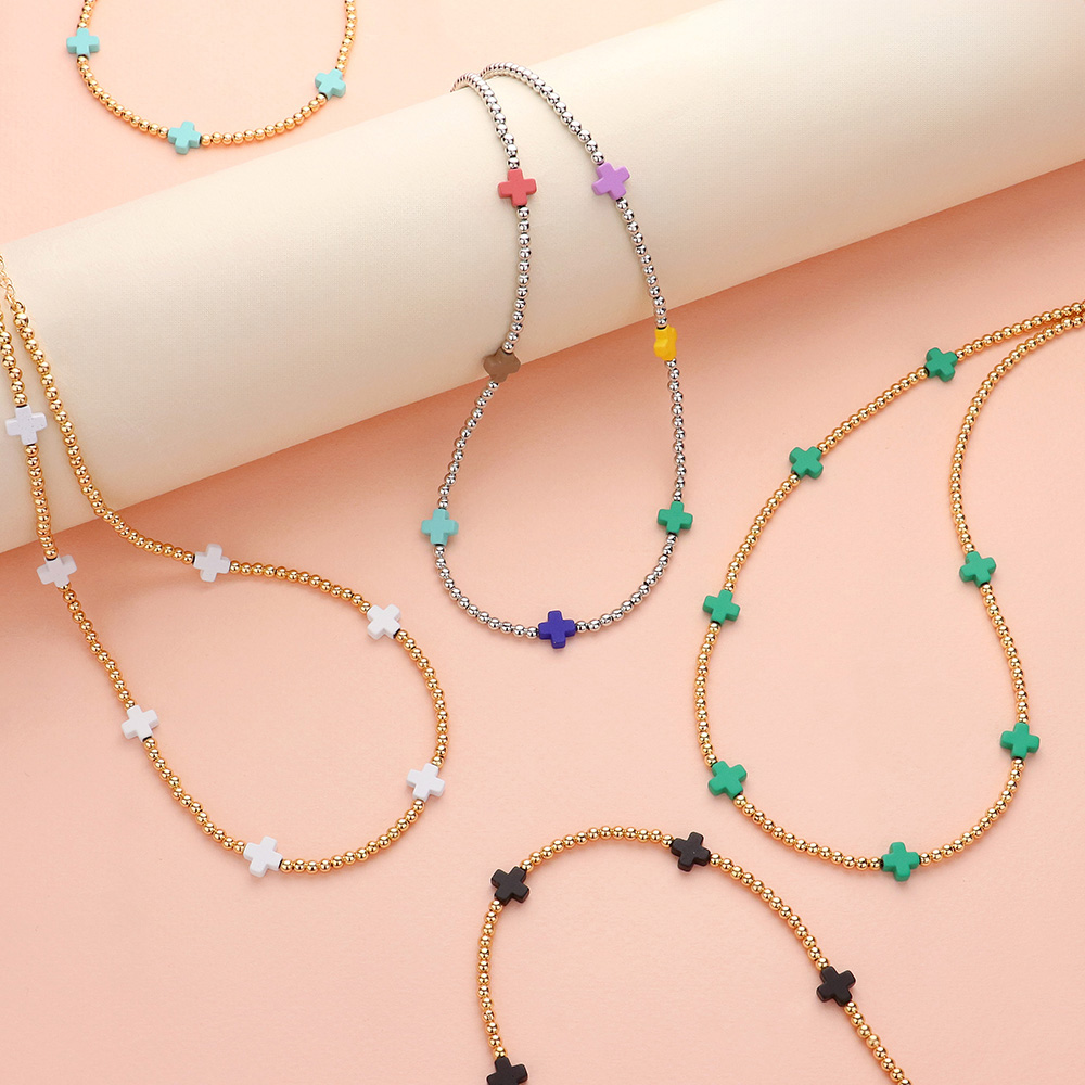 5PCS - Metal Cross Accent Faceted Beaded Stretch Multi Layered Bracelets