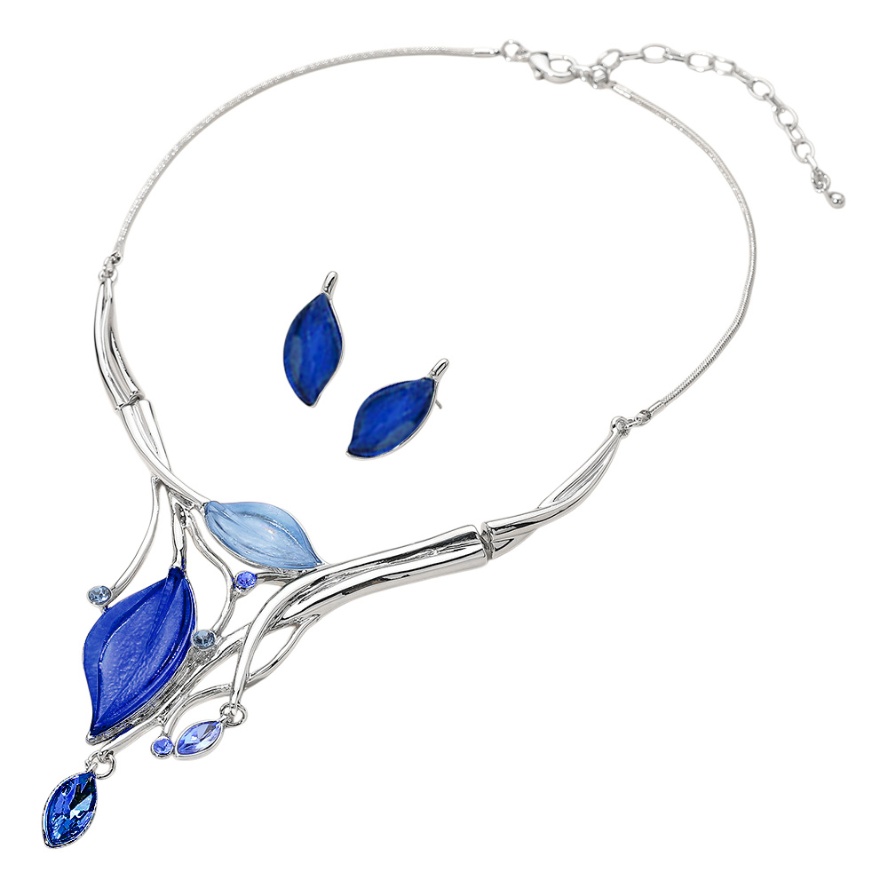 • Elegant leaf pendant necklace with matching earrings featuring sleek metallic accents and delicate leaf shapes. This jewelry set adds a refined and feminine touch, perfect for formal occasions or stylish everyday wear.