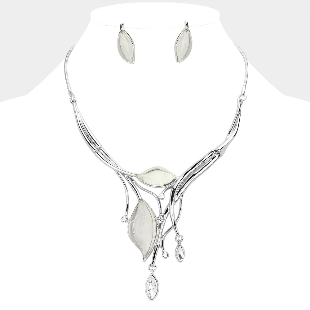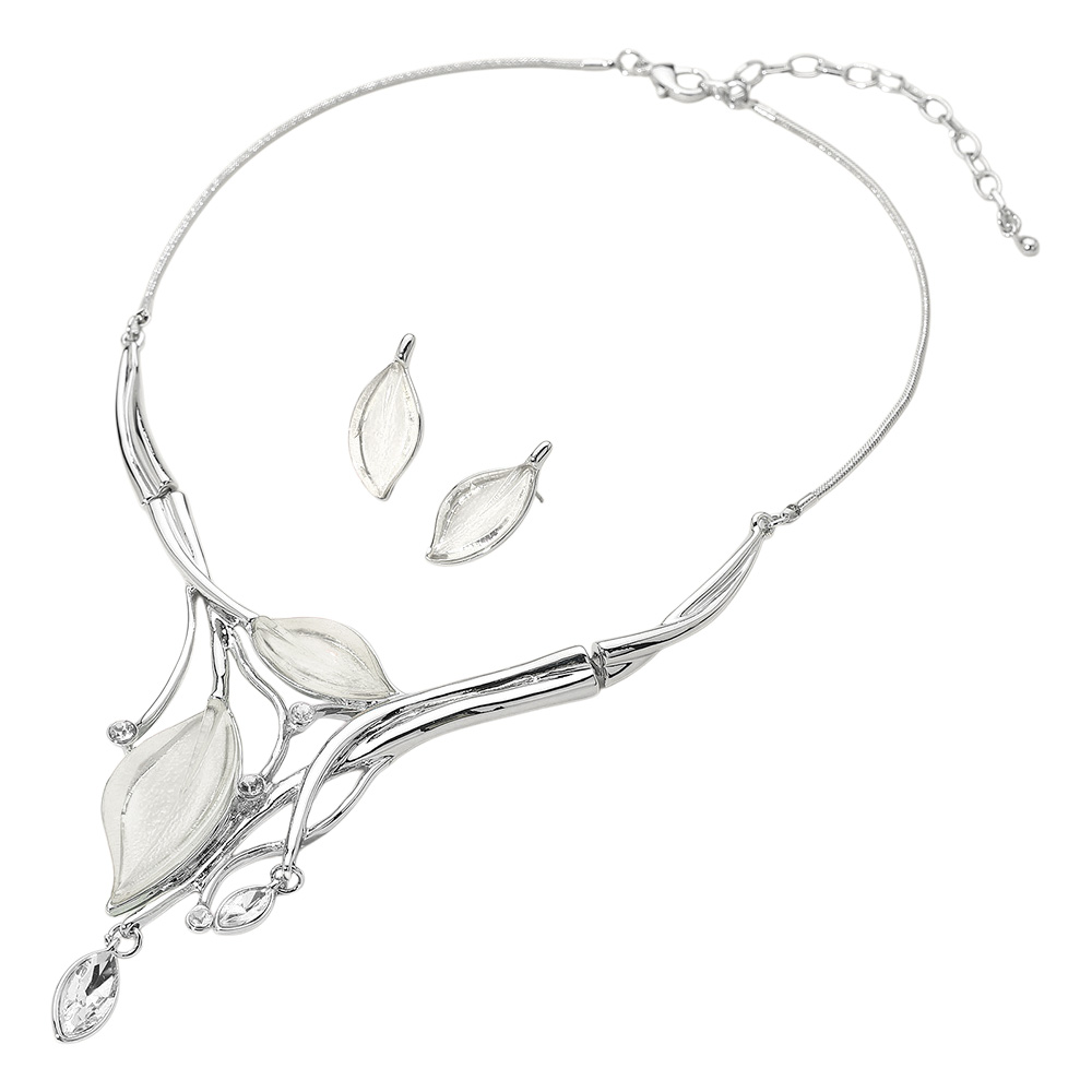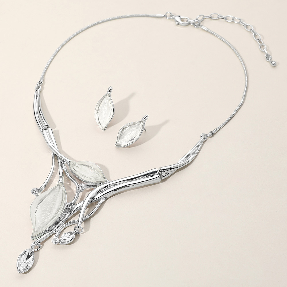 • Elegant leaf pendant necklace with matching earrings featuring sleek metallic accents and delicate leaf shapes. This jewelry set adds a refined and feminine touch, perfect for formal occasions or stylish everyday wear.