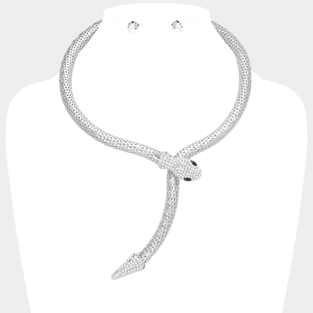 Details • Necklace Size : 17" L • Decor Size : 4" L • Earring Size : 0.3" L • Make a daring impression with this serpent-inspired statement necklace. Designed with shimmering crystals and a striking wrap-around style, it’s perfect for elevating evening looks or adding edge to any outfit. A bold accessory for confident style.
