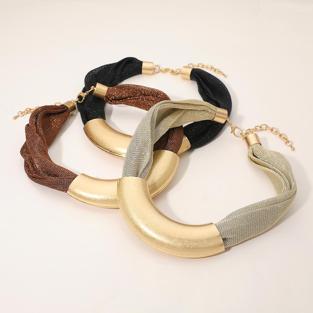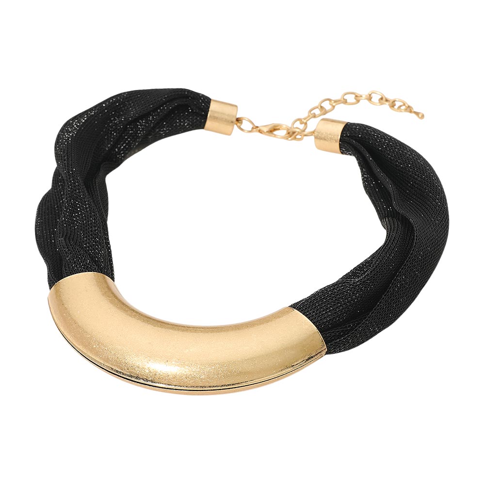 Details • Necklace Size : 18" + 3" L • Decor Size : 1.25" L • Bold statement necklace featuring a multi-strand mesh chain and a sleek curved metal bar centerpiece. Adjustable for a comfortable fit, this modern accessory elevates casual and dressy outfits with effortless style. Perfect for gifting or adding a chic, contemporary touch to any jewelry collection. • Lead and Nickel Compliant