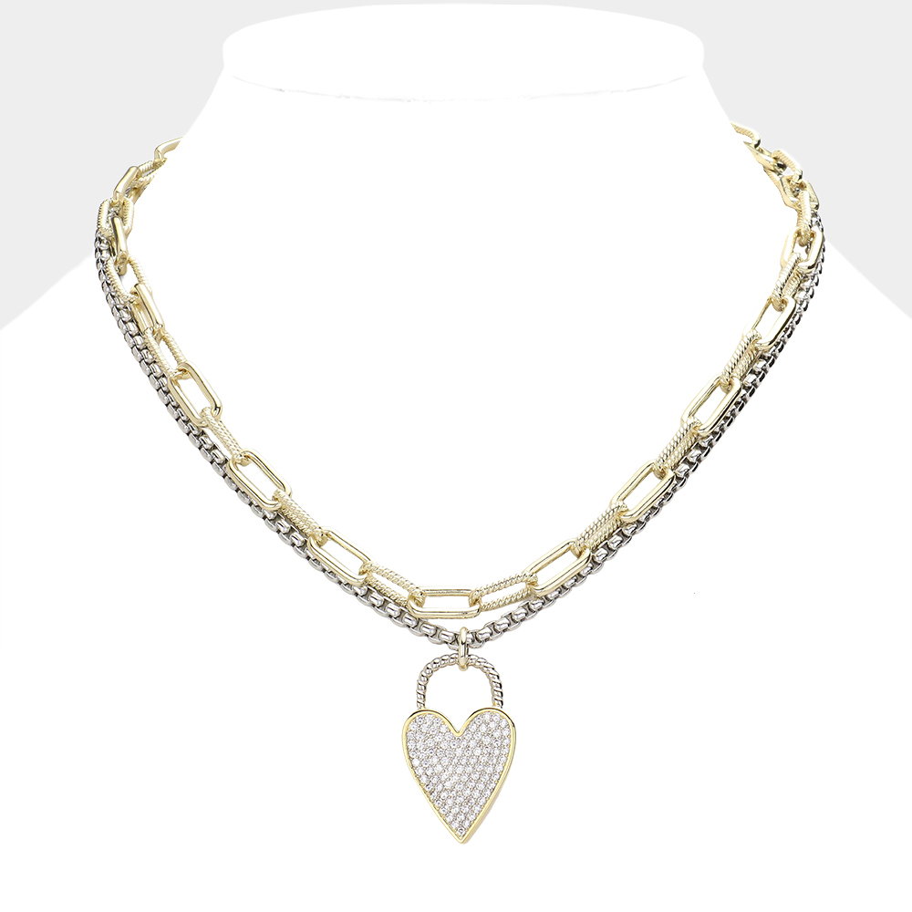 Details • Necklace Size : 16.75" + 2" L • Decor Size : 2" L • Statement necklace with layered chunky chains and a sparkling crystal heart lock pendant. A bold and romantic accessory that elevates any outfit with charm and elegance. Ideal for layering or solo wear. • CZ Cubic Zirconia