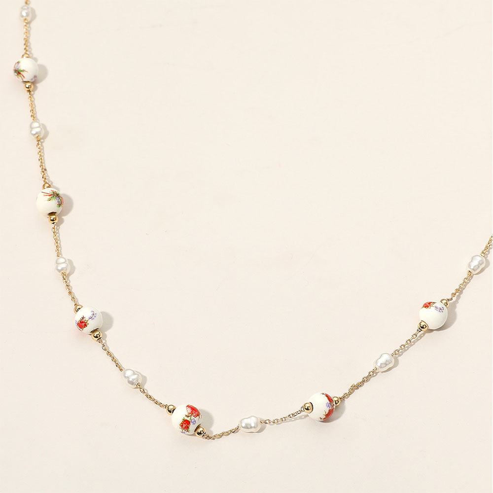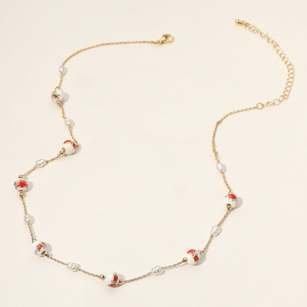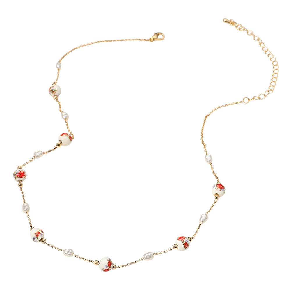 Details • Necklace Size : 16" + 3" L • Decor Size : 0.25" L • Enhance your look with this delicate beaded necklace featuring charming floral-patterned beads and luminous accents along a fine chain. Perfect for layering or wearing on its own, this necklace adds a touch of elegance and artistic detail to everyday and special outfits. • Lead and Nickel Compliant
