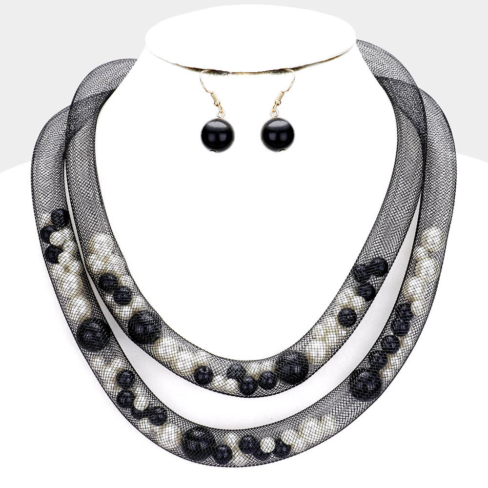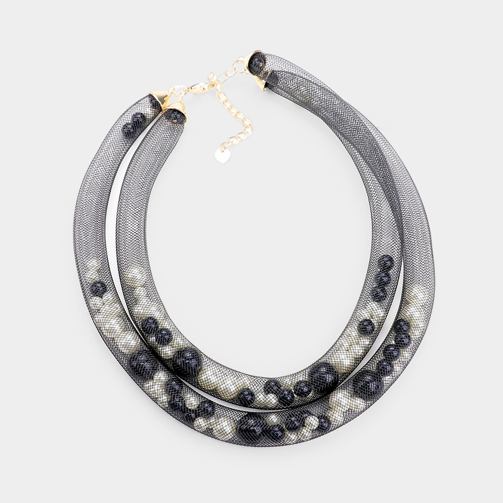 Pearl Accented Triple Layered Mesh Bib Necklace