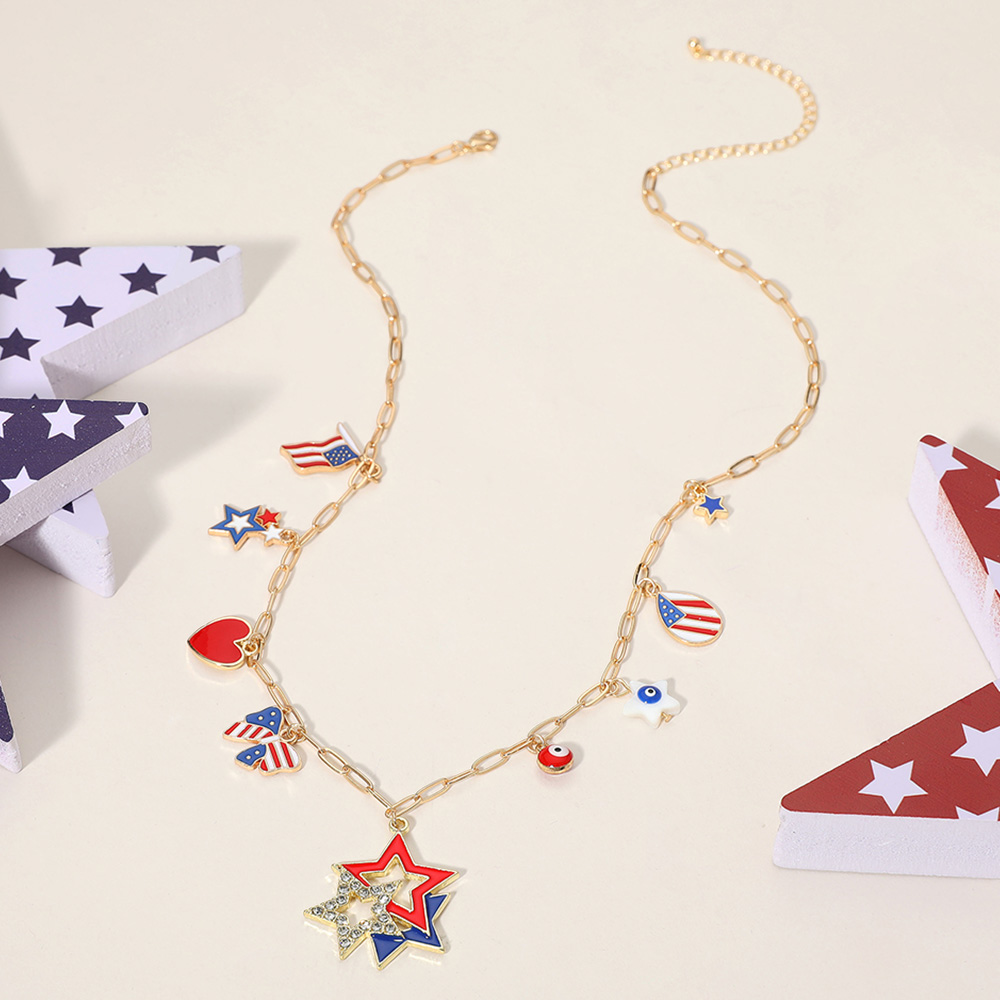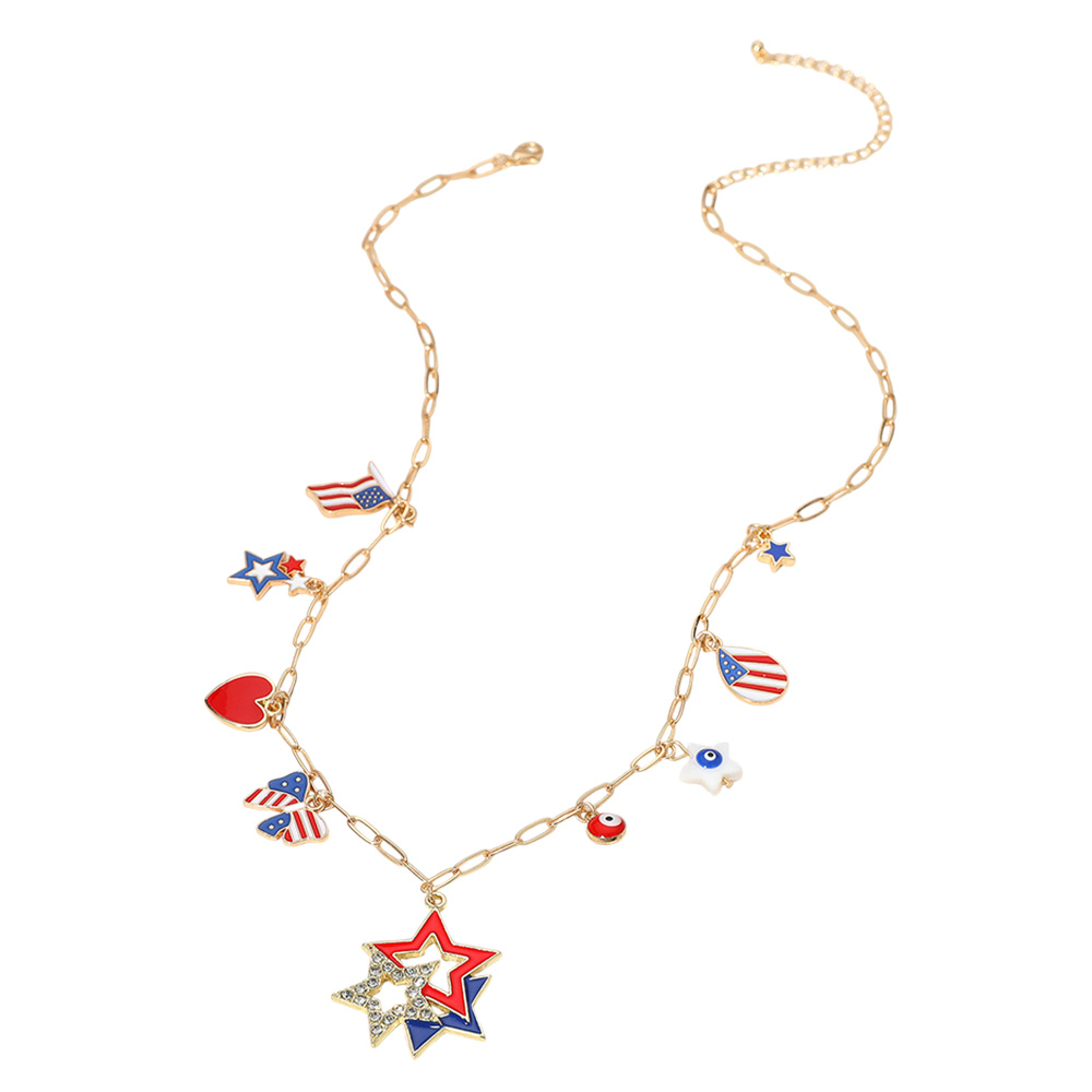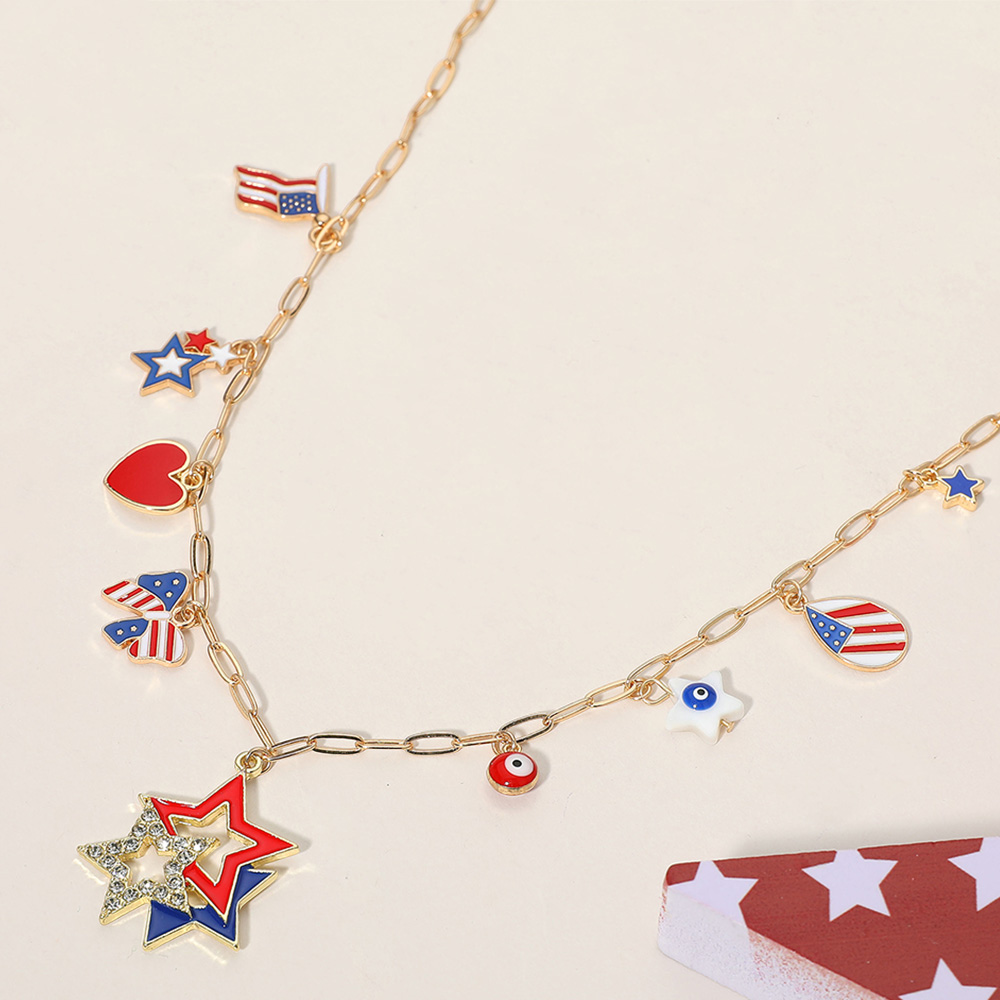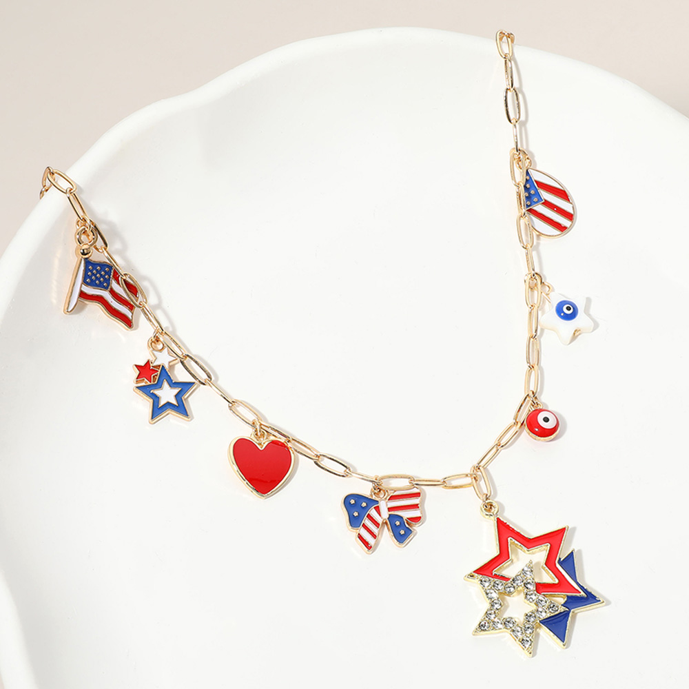 Enamel American USA Flag Bow Heart Star Evil Eye Charm Station Paperclip Chain Necklace